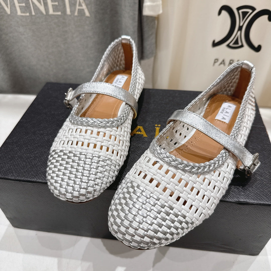 ALAIA MARY JANE FLATS white mix gray woven calfskin pattent