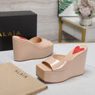 ALAIA PLATFORM WEDGE IN BEIGE TAN LAMBSKIN WITH RED HEART