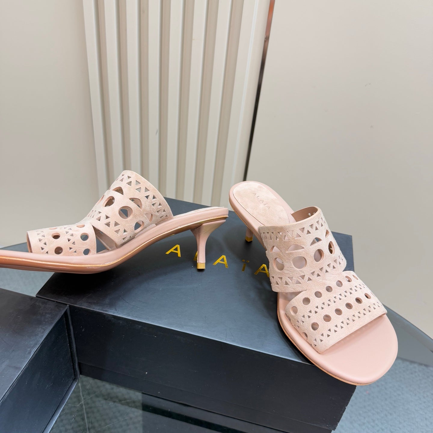 Alaia Vienne Cutout Kitten-Heel Slide Sandals Pink Sheepskin 299665