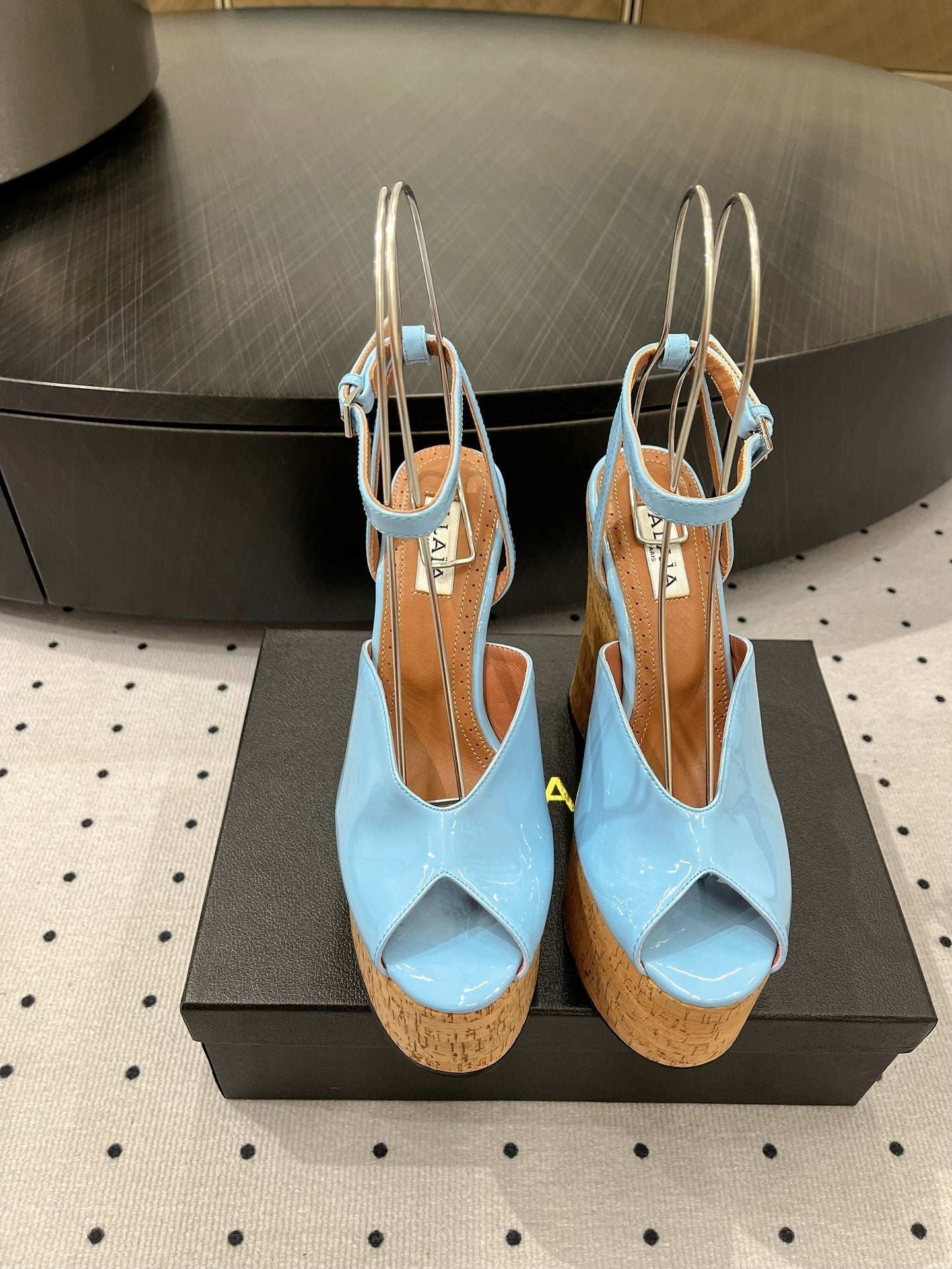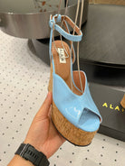 Alaila Wedge Sandals 135mm In Light Blue Glossy Lambskin 954899