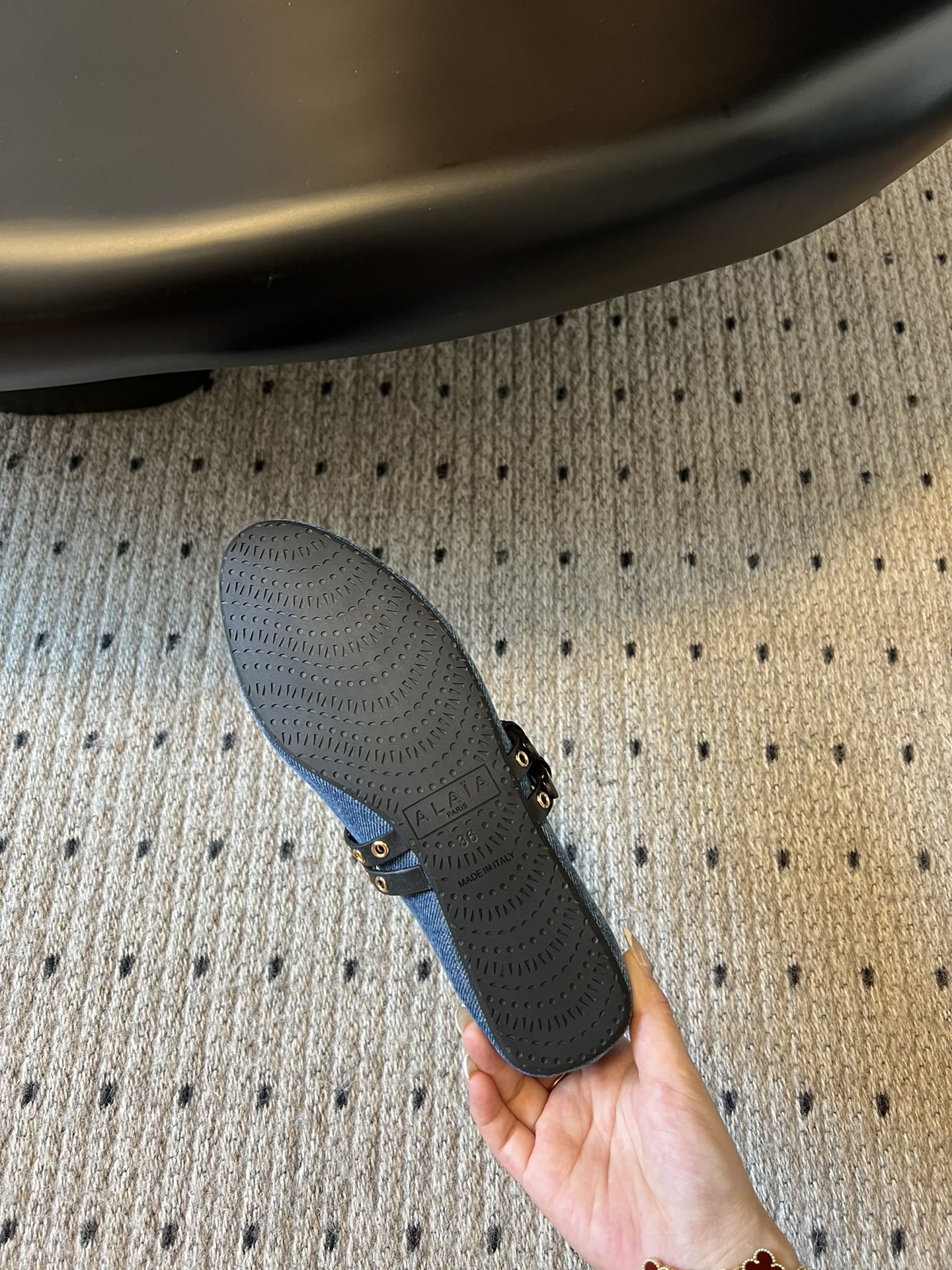 ALAIA FLAT MULES IN LIGHT BLUE MESH FISHNET