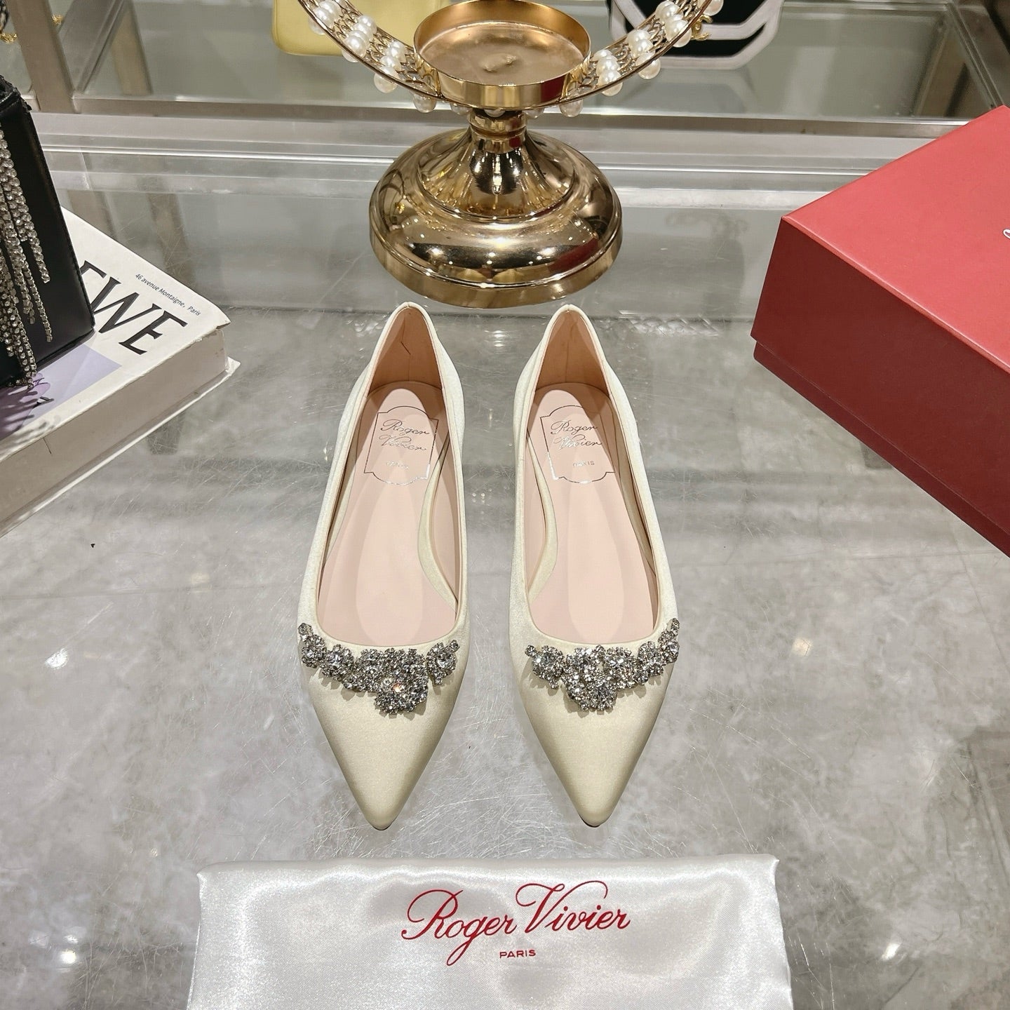 Viv 25 Crystal Diamond Buckle Flats Beige Silk Satin 235393