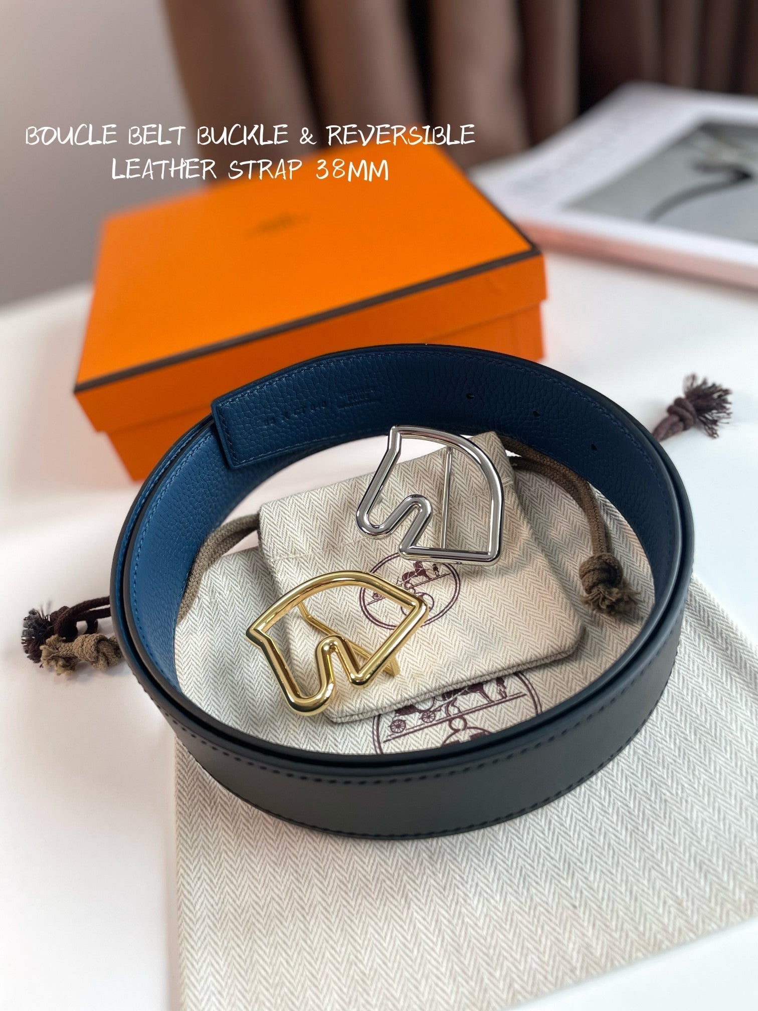 TUBE H BELT GOLD BUCKLE & REVERSIBLE NAVY BLUE LEATHER STRAP 38MM