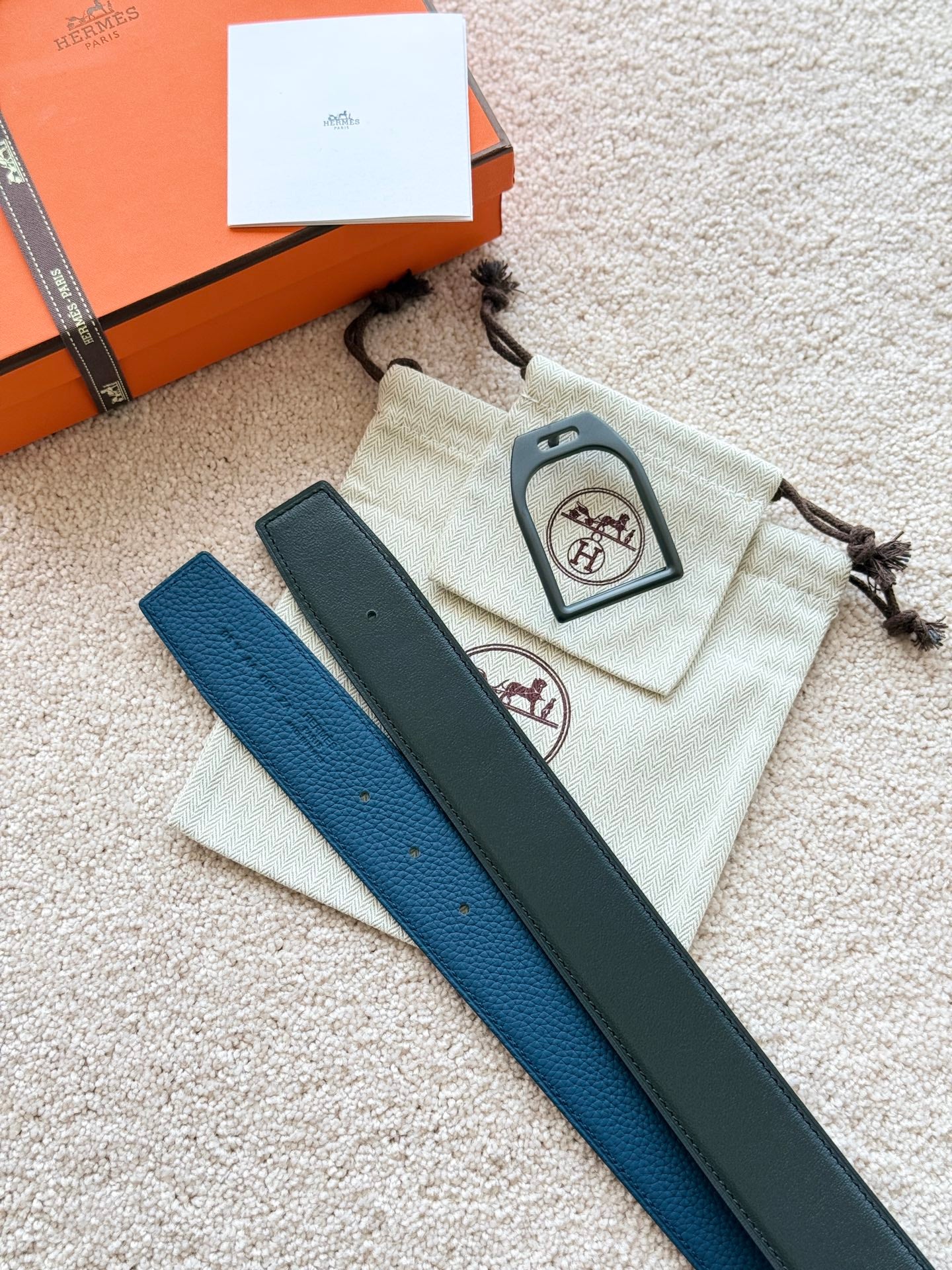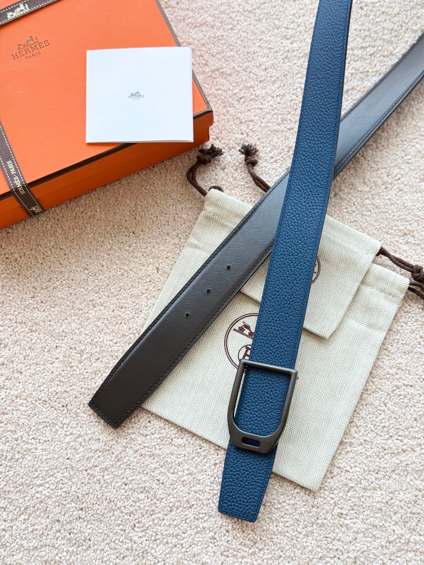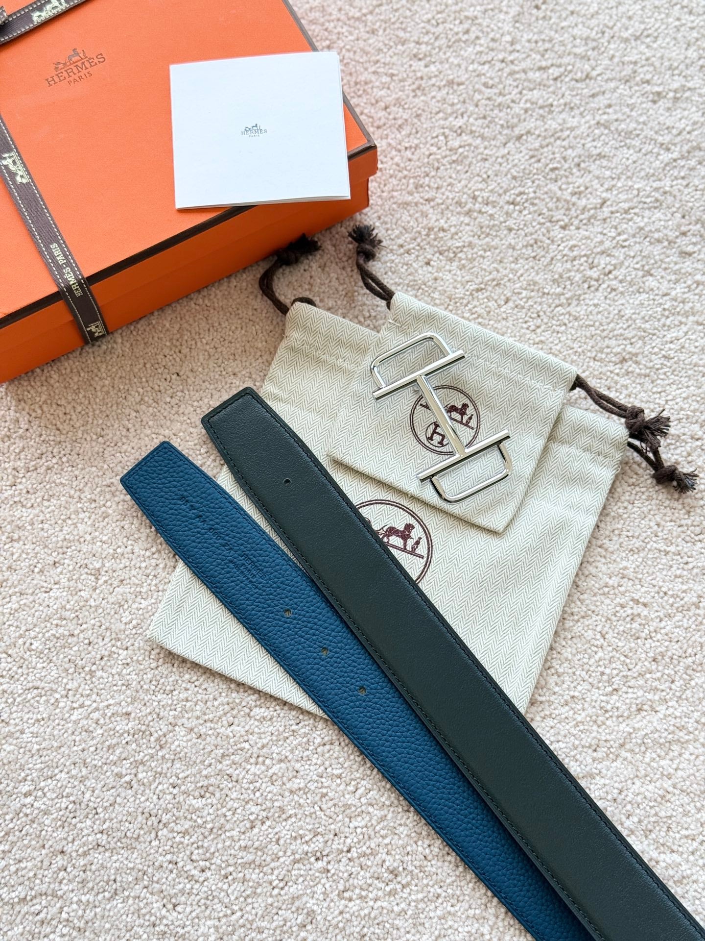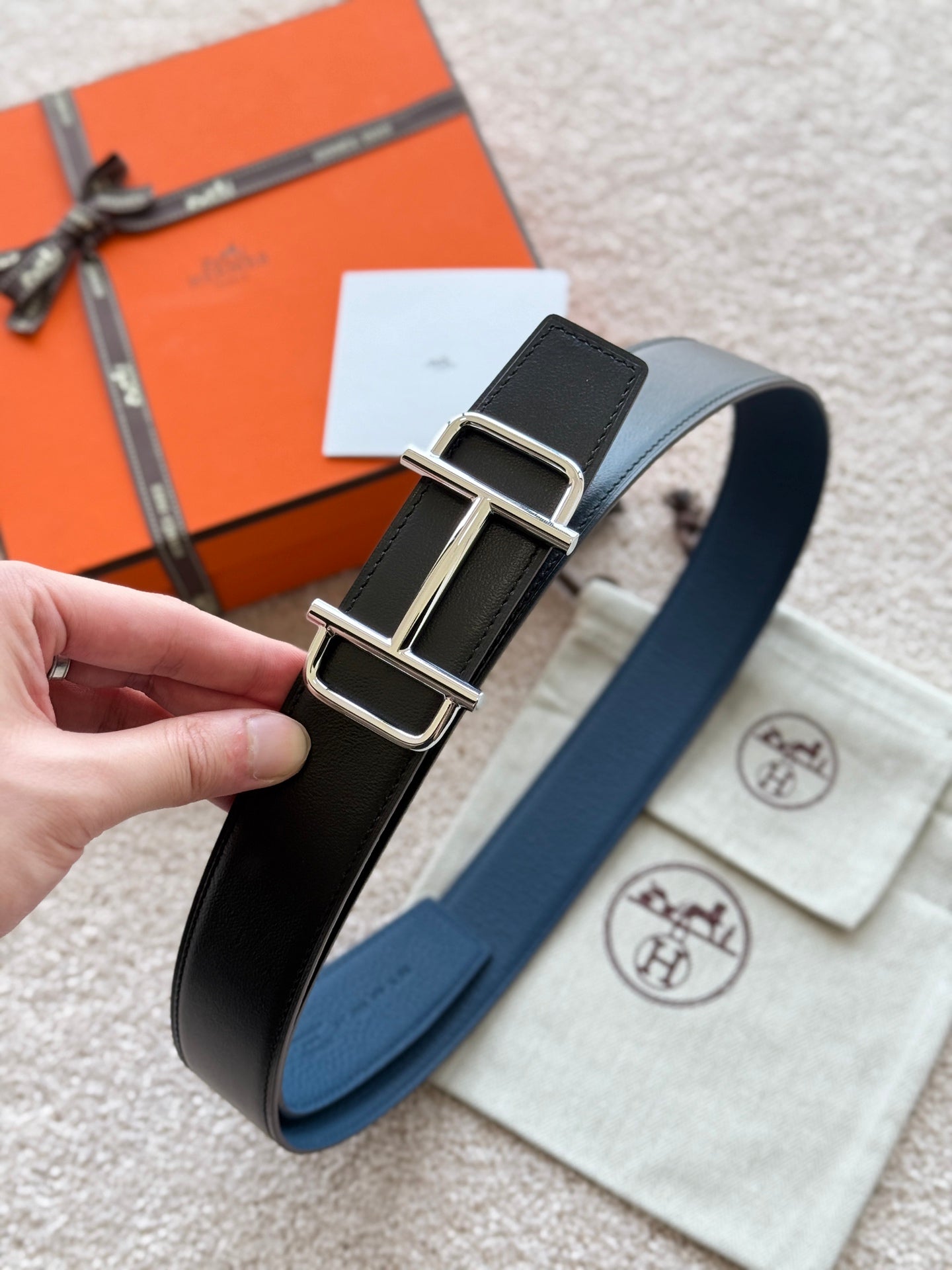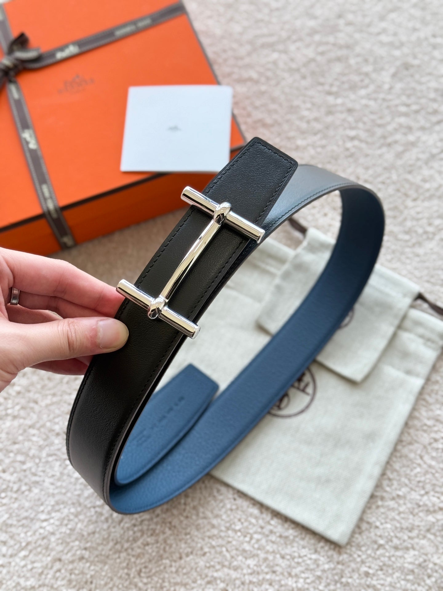 HM Silver Tube H Buckle Belt 38mm Prussian blue Black Leather 187523