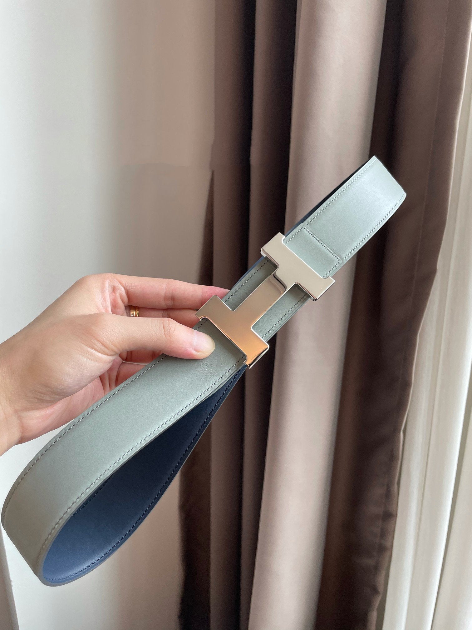 H MARIN REVERSIBLE BELT 32MM SILVER BUCKLE GOLD TIN GREY LEATHER