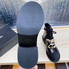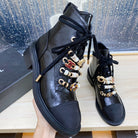 CC COMBAT BOOTS IN BLACK WRINKLED CALFSKIN AND GROSGRAIN WITH FAUX PEARL