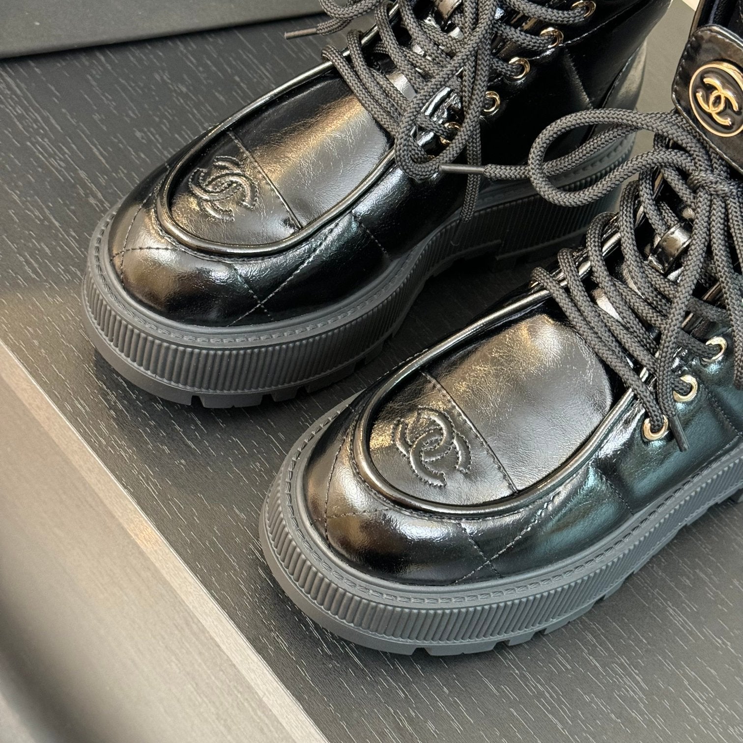 CC Short Boots Glossy Black Quilted Cowhide