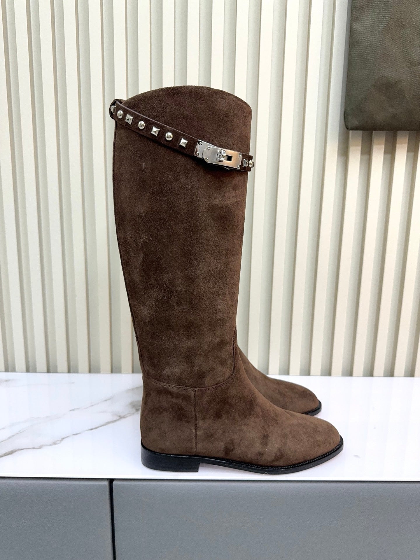HM 25ss Kelly Buckle Riding Boots Dark Brown Suede 576118