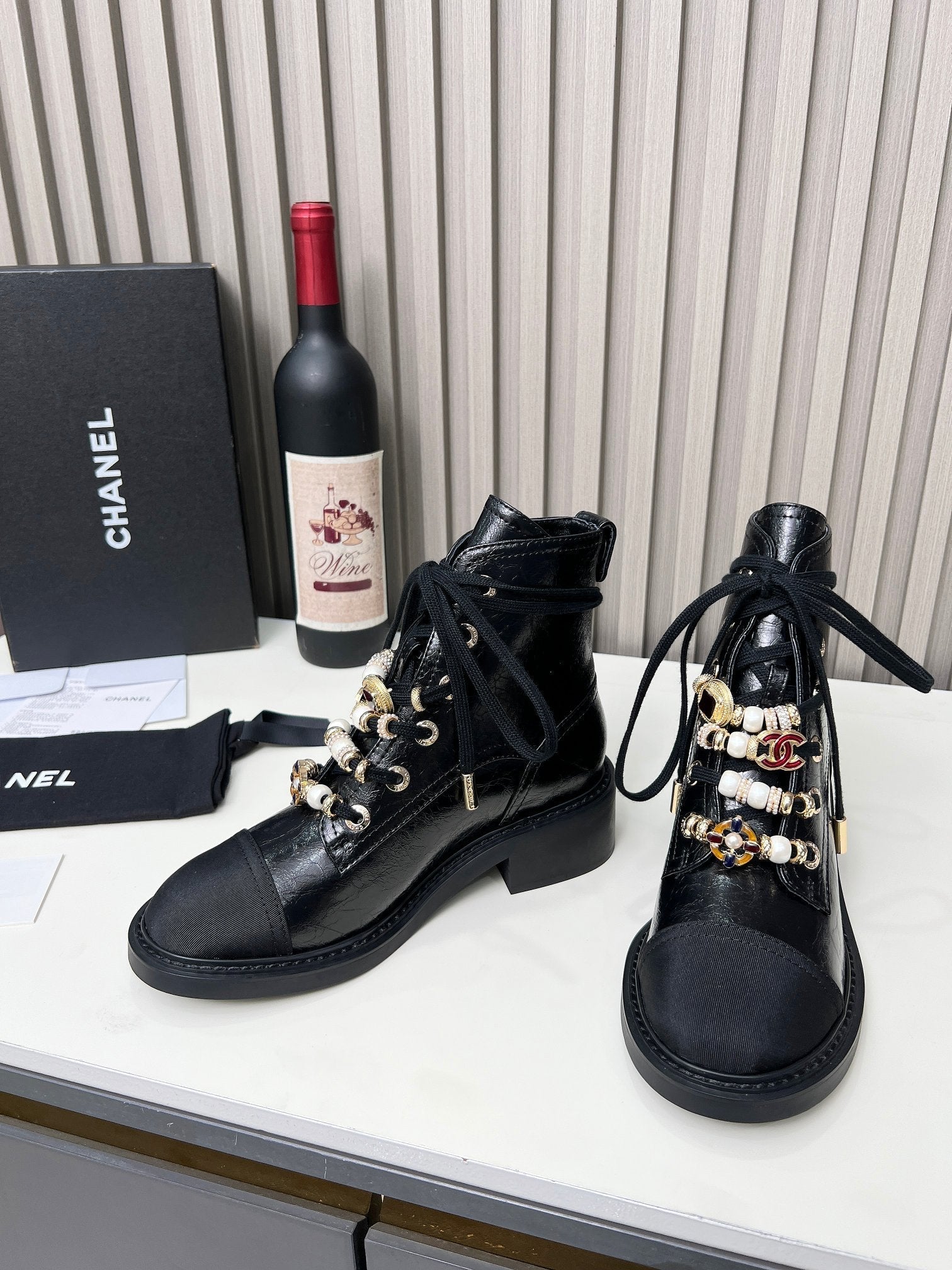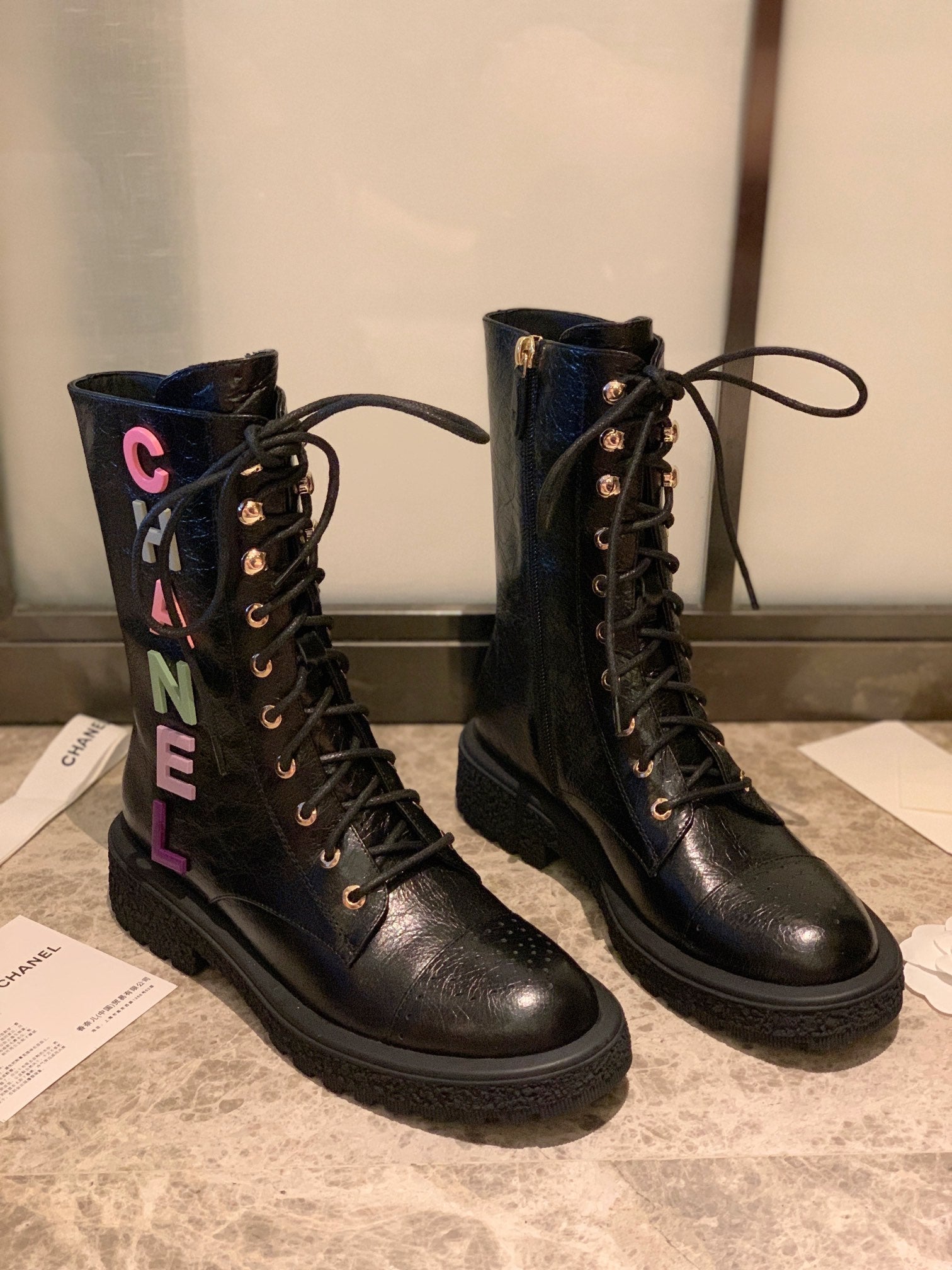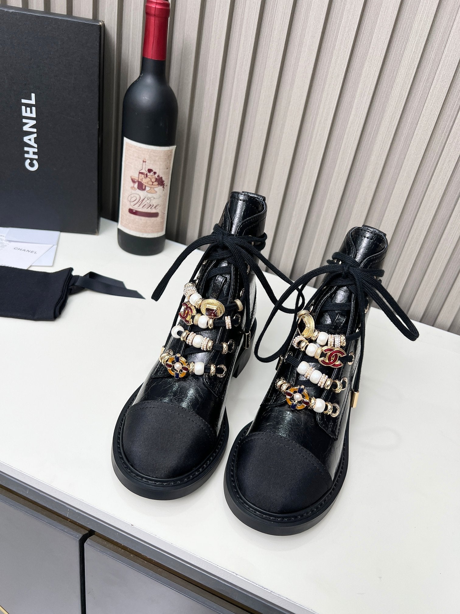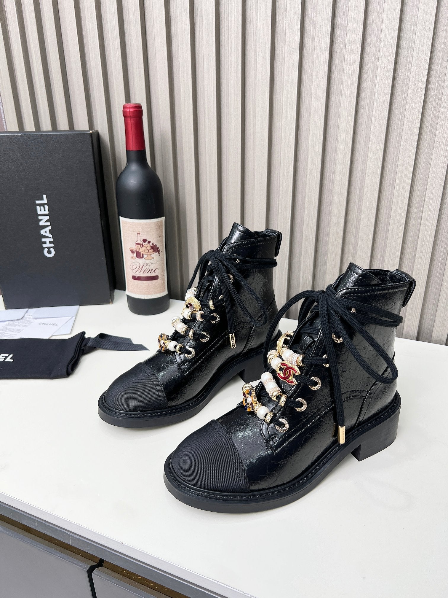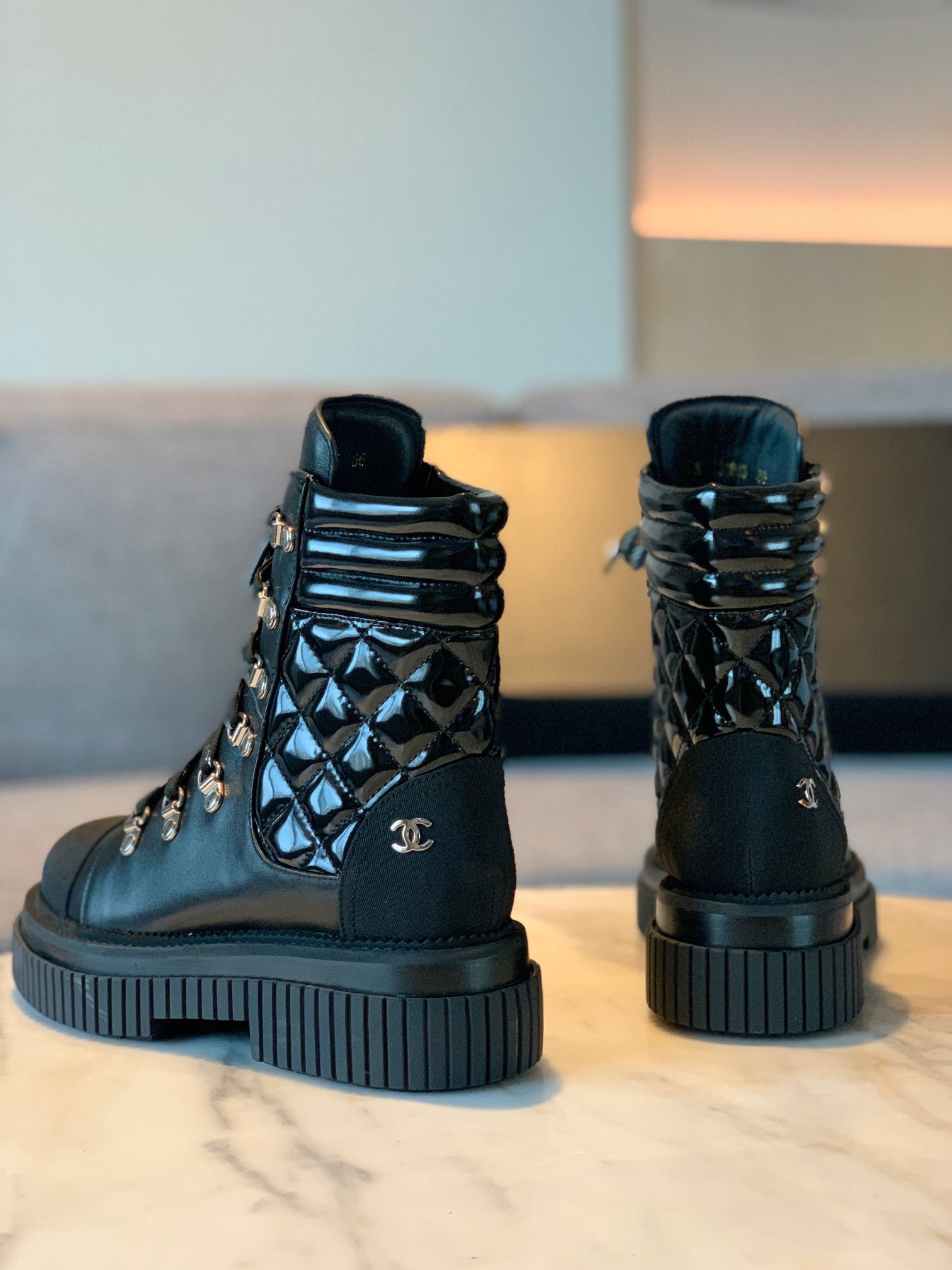 CC Combat Boots 50mm In Black Glossy Calfskin Quilted And Lycra Fabric 940073