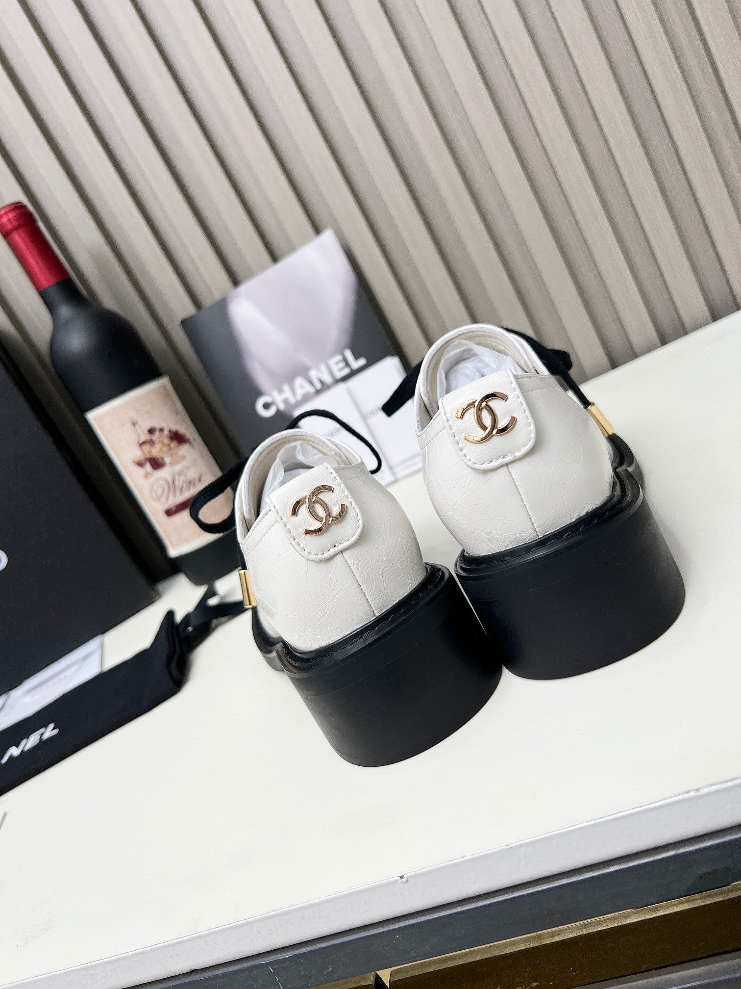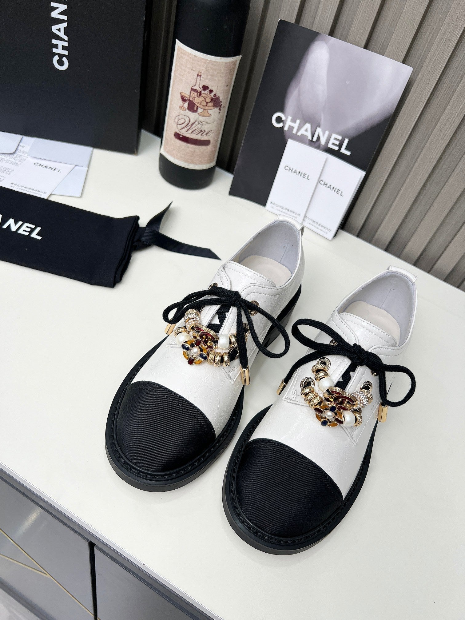CC High Mary Janes 55mm White With Black Bow Glossy Calfskin 943288