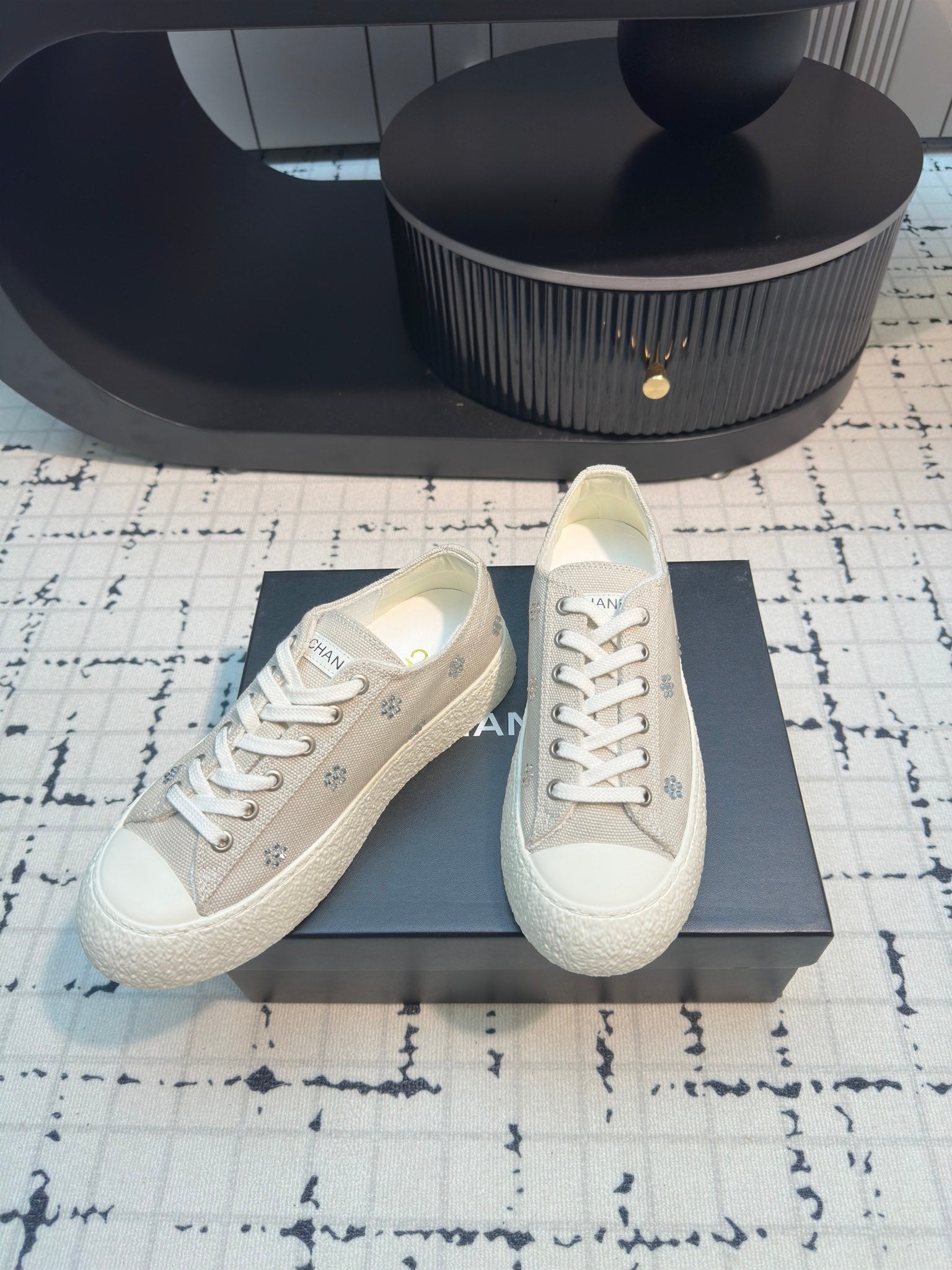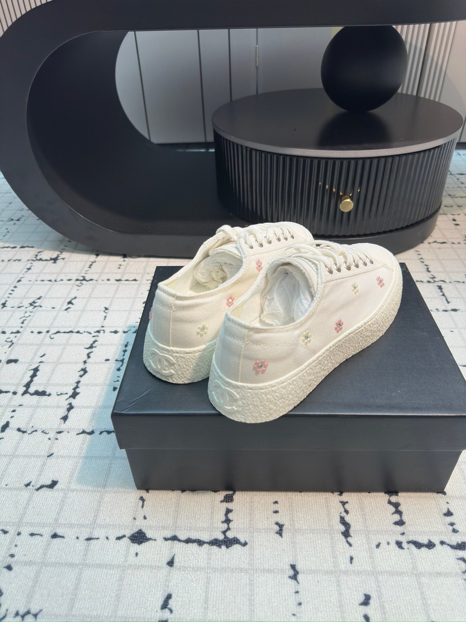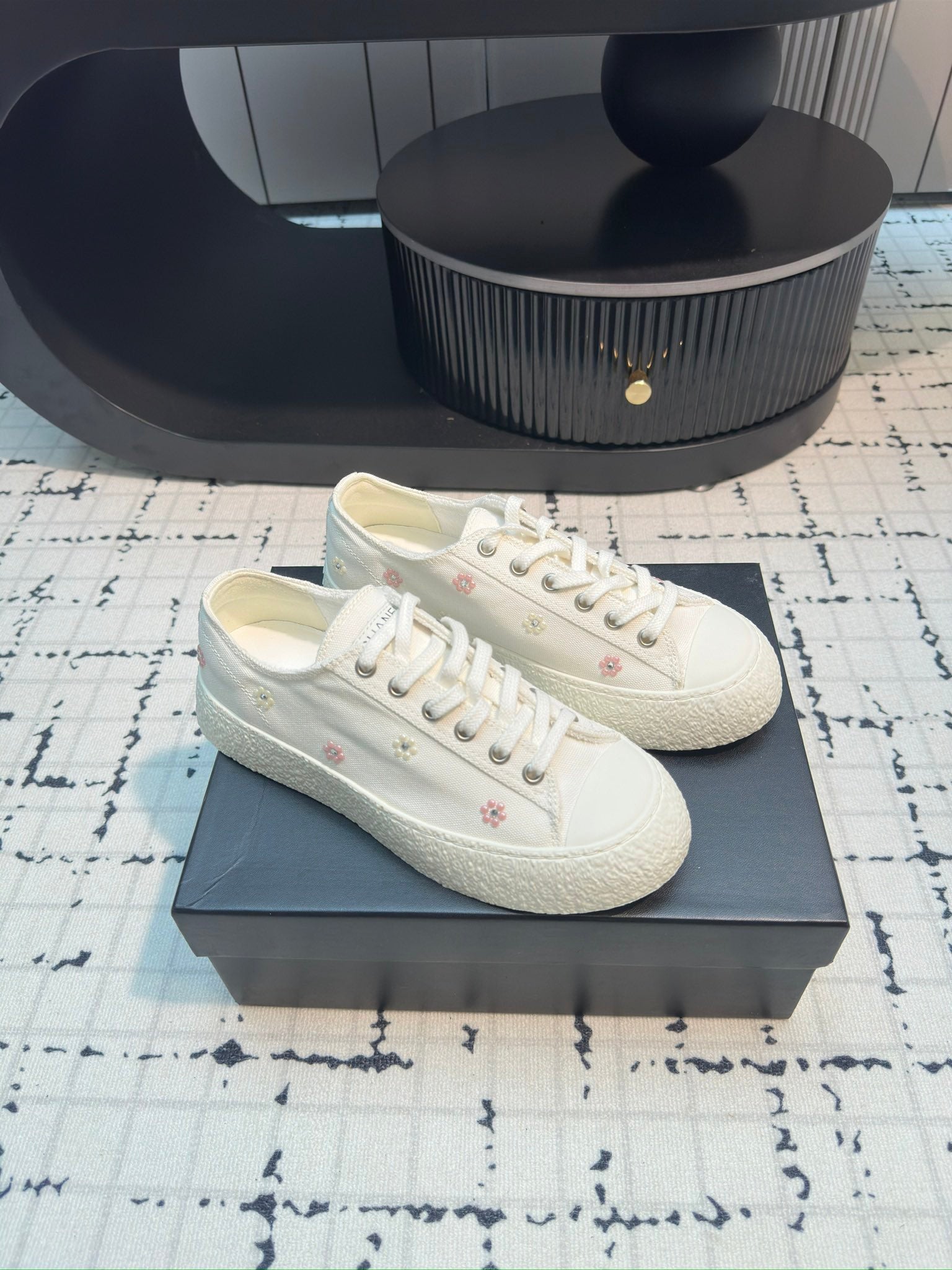 CC Low Sneaker 30mm Black Mix White With Small Flowers Cavas Fabric