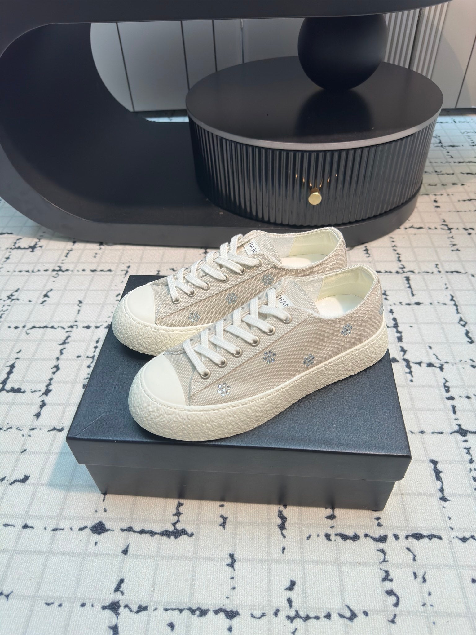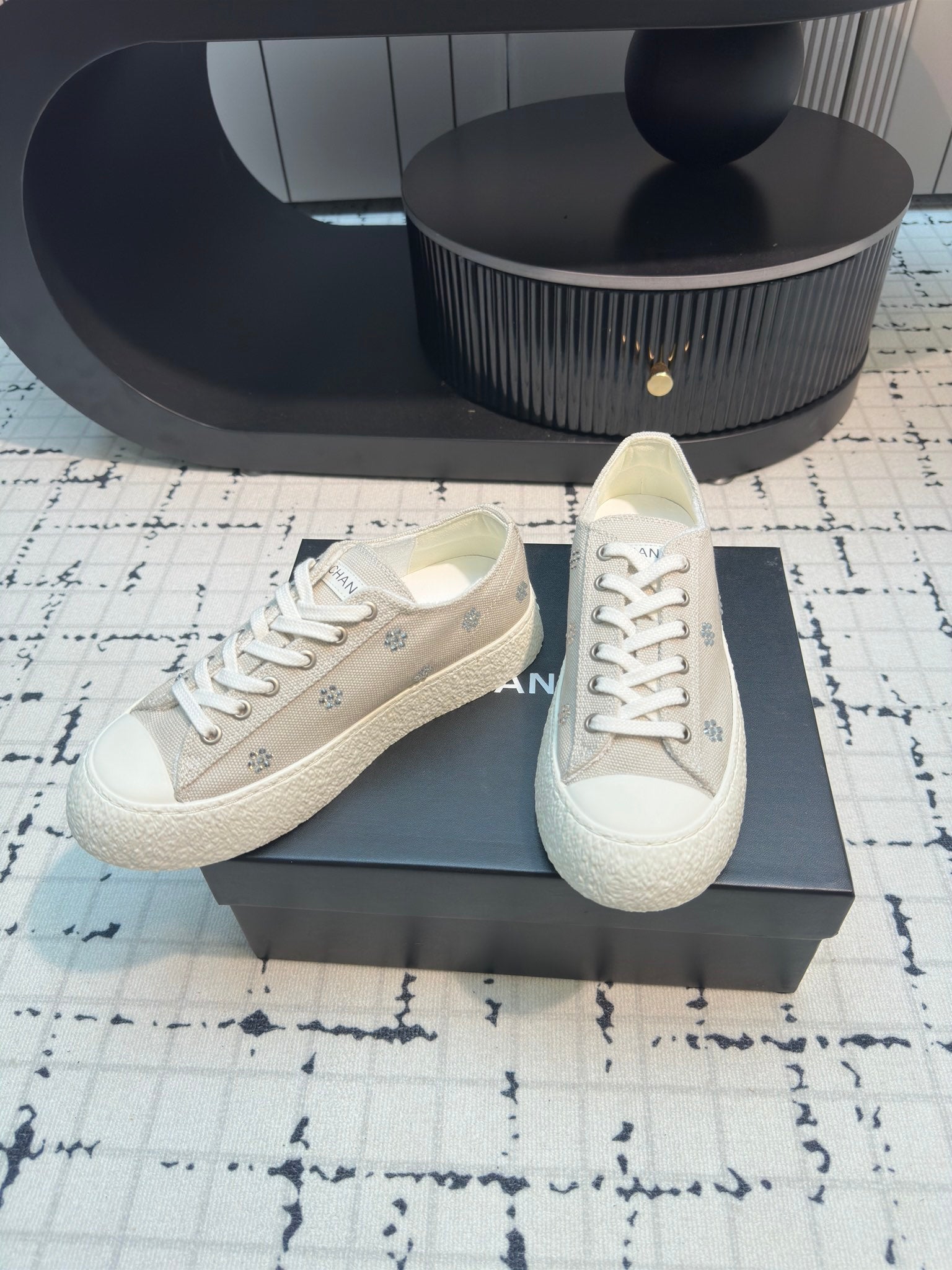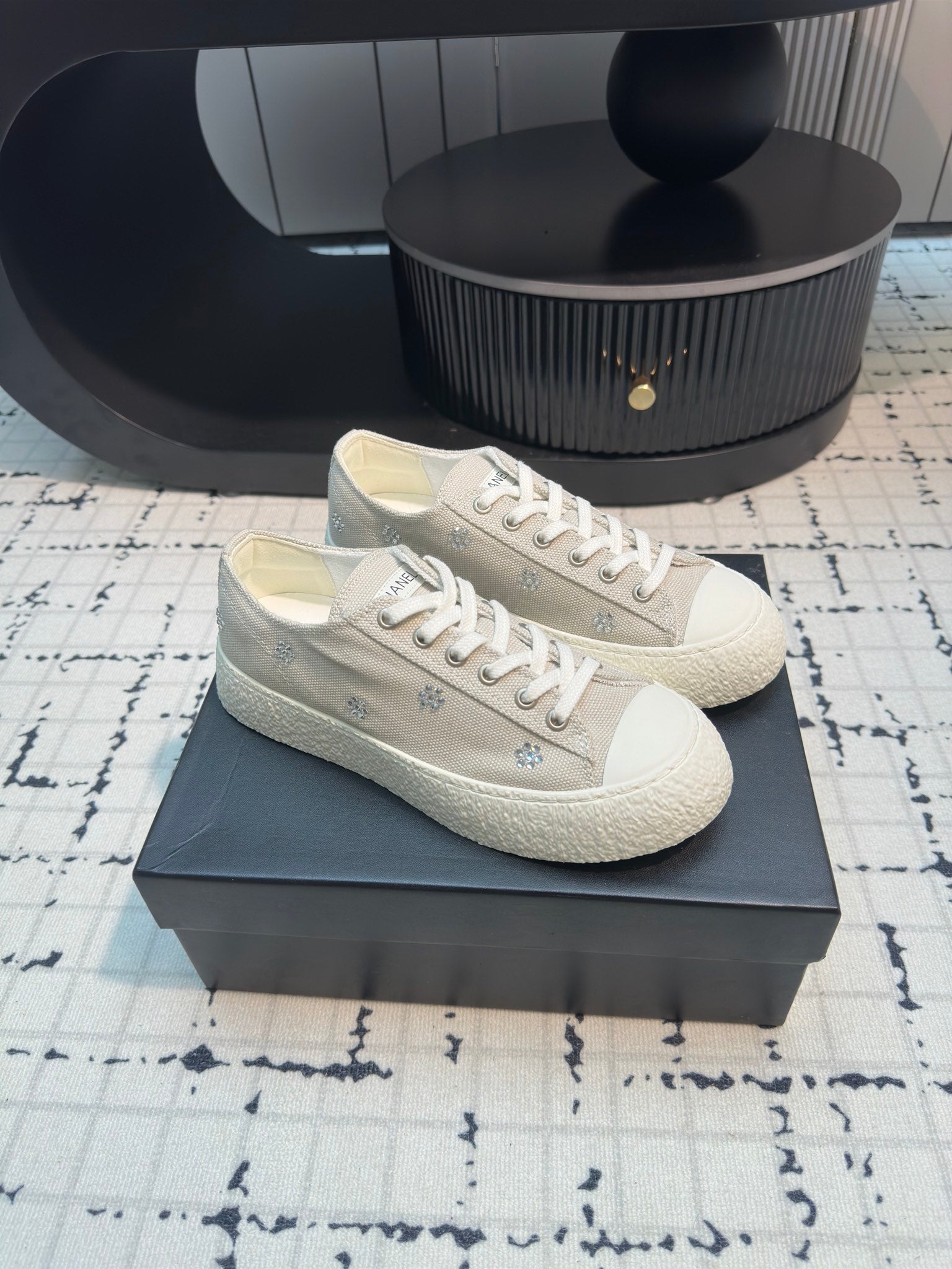 CC Low Sneaker 30mm Black Mix White With Small Flowers Cavas Fabric