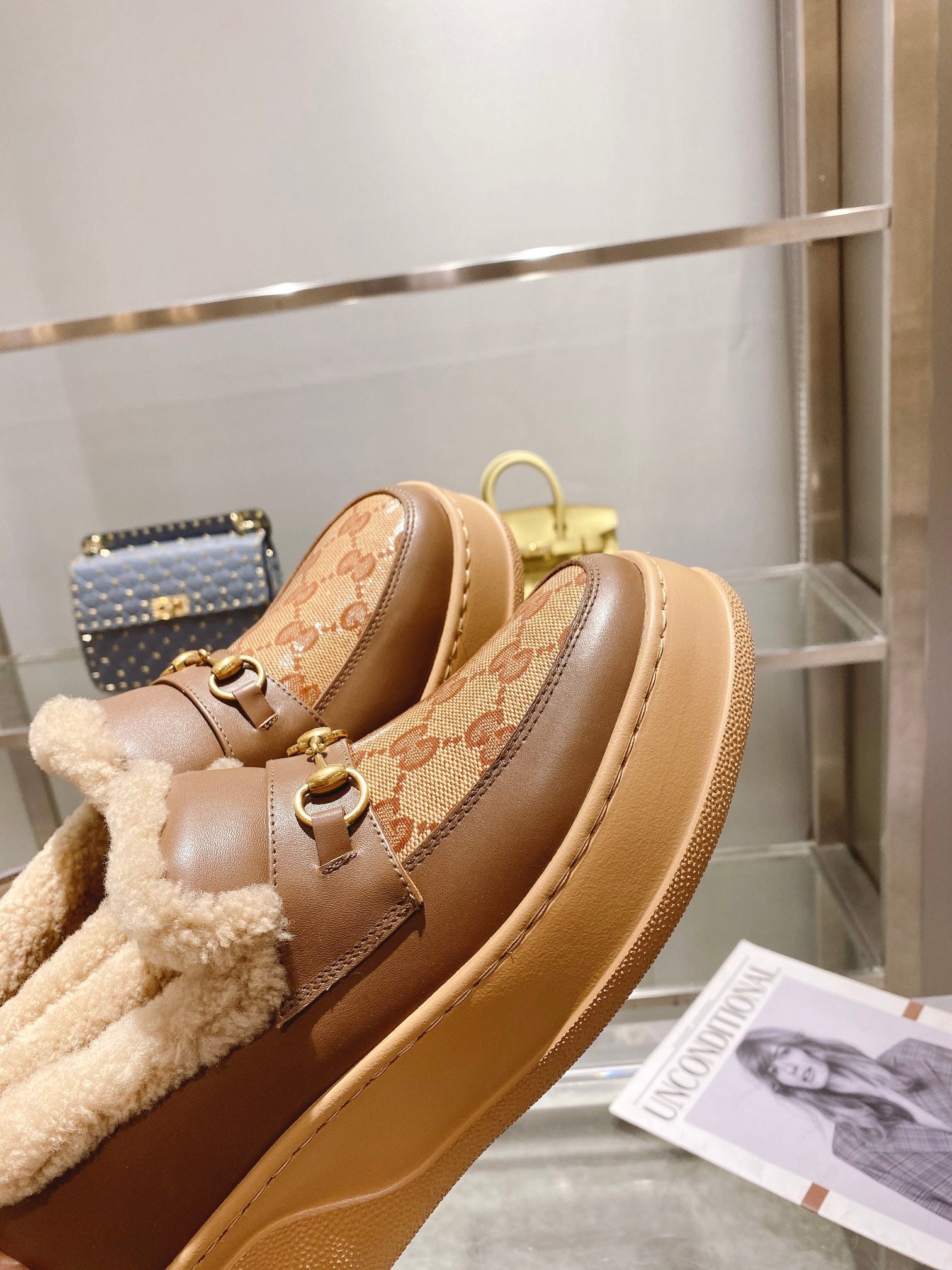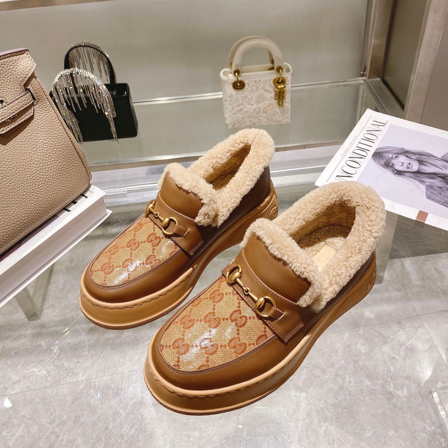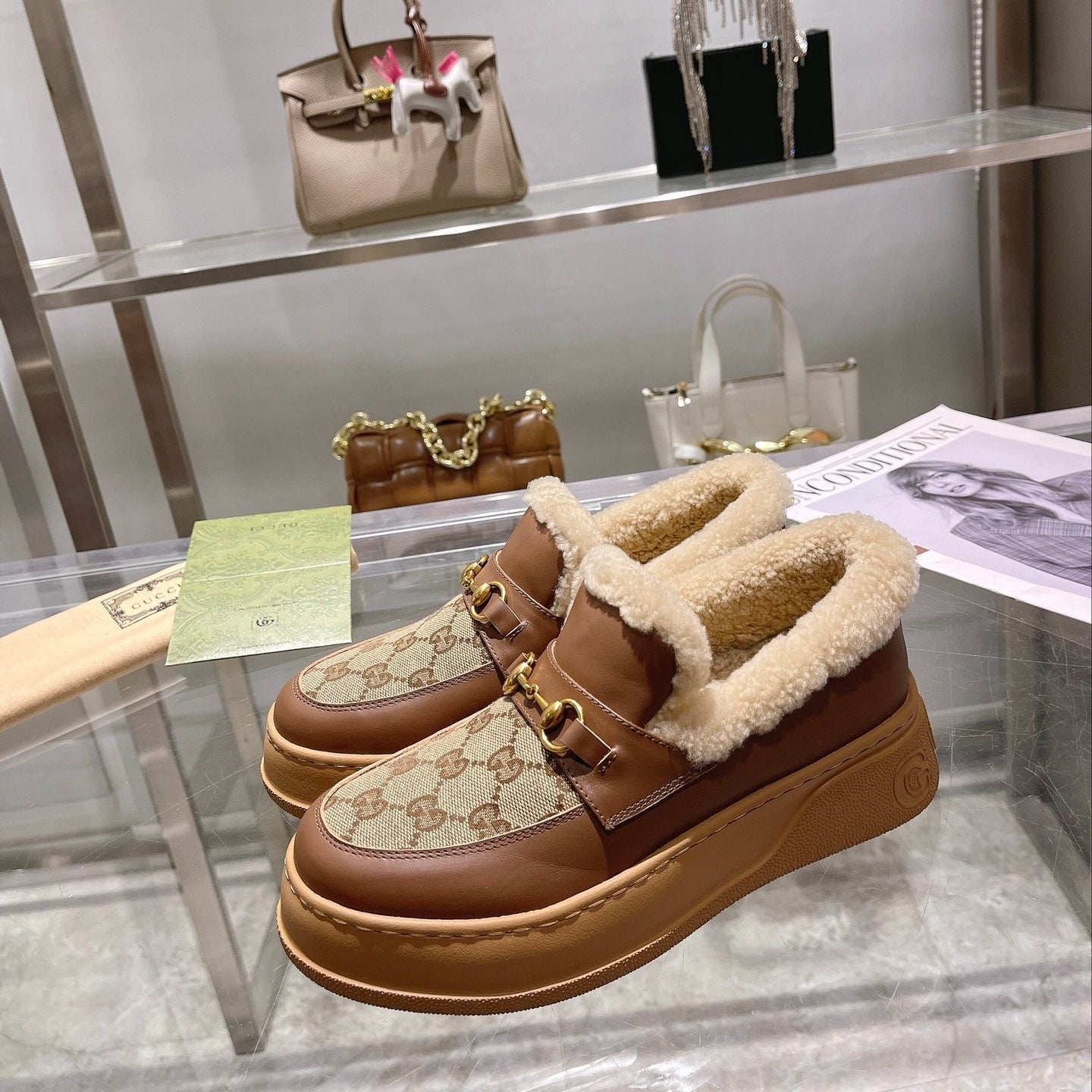 GG Snow Boots Brown Patent Calfskin Wool 576237