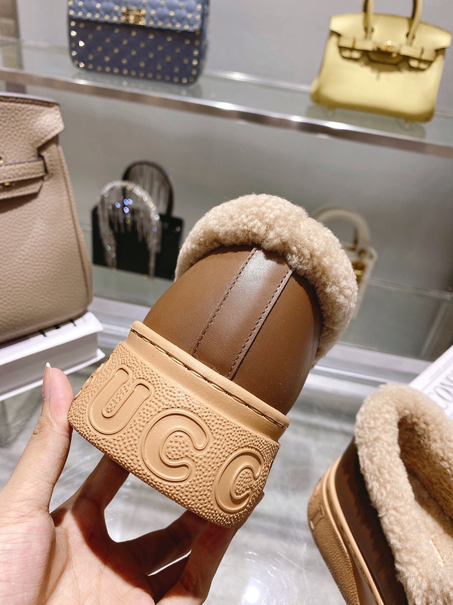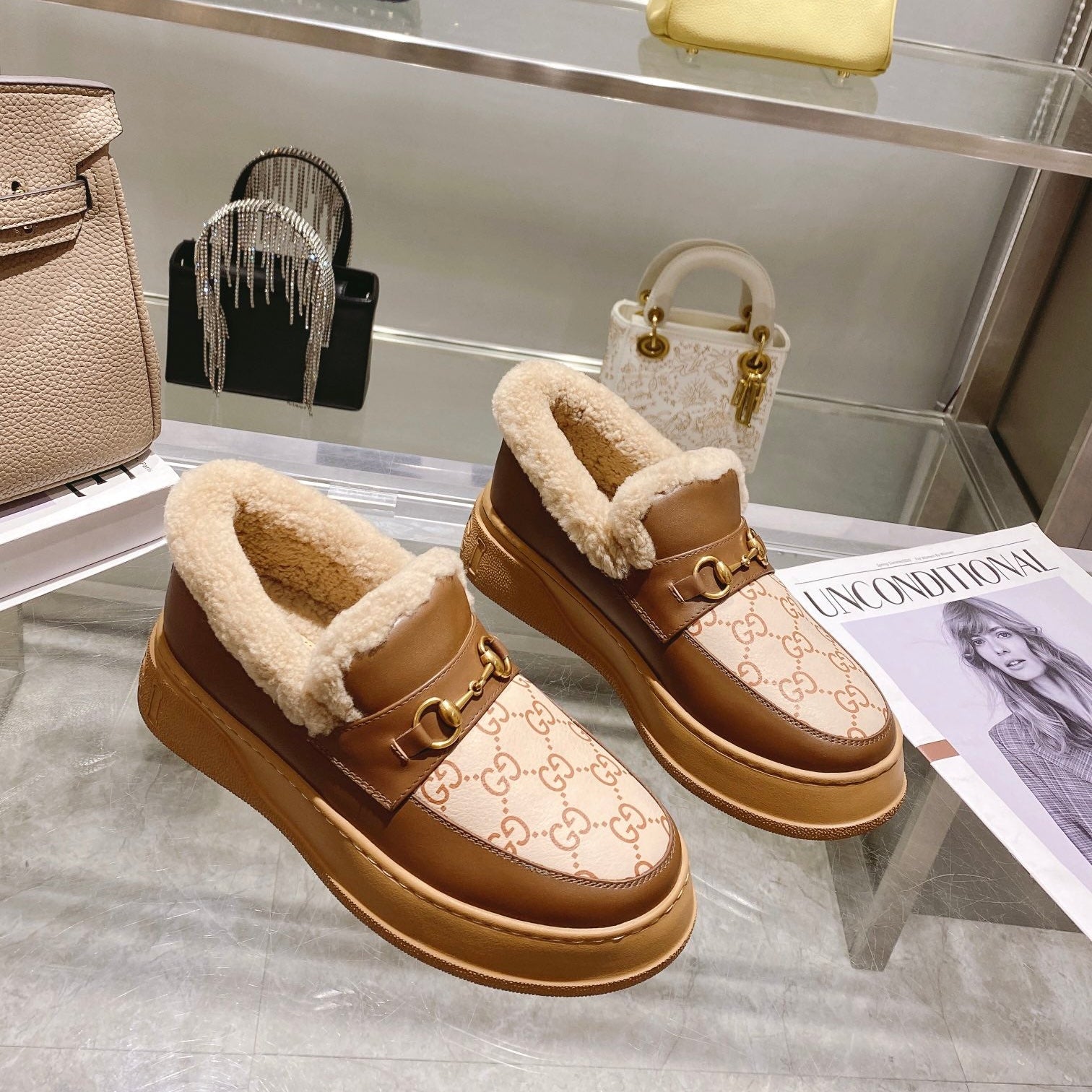GG Snow Boots Brown Beige Cowhide Wool 576235