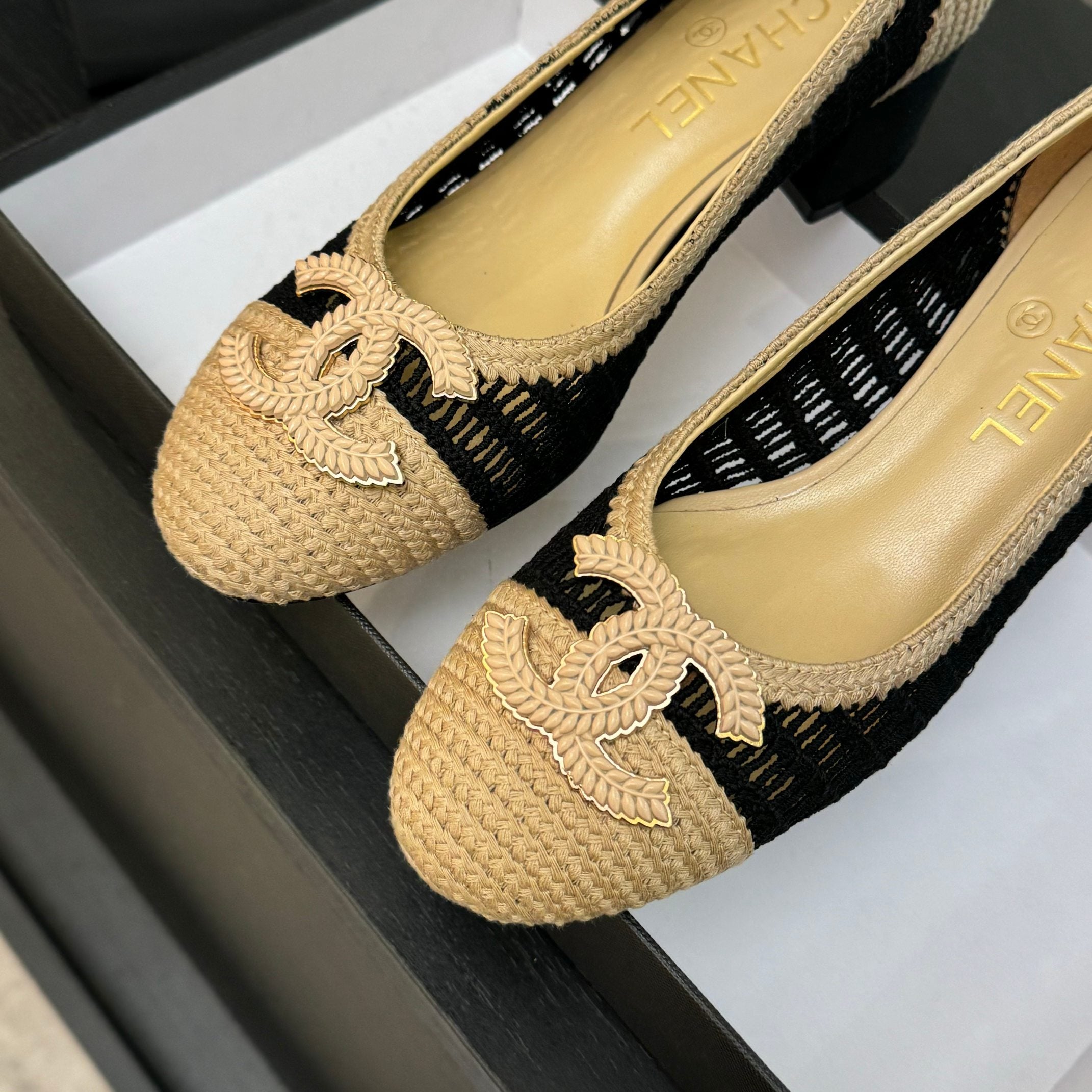 CC 25P Ballet Heel 50mm Black Beige Raffia Large Logo