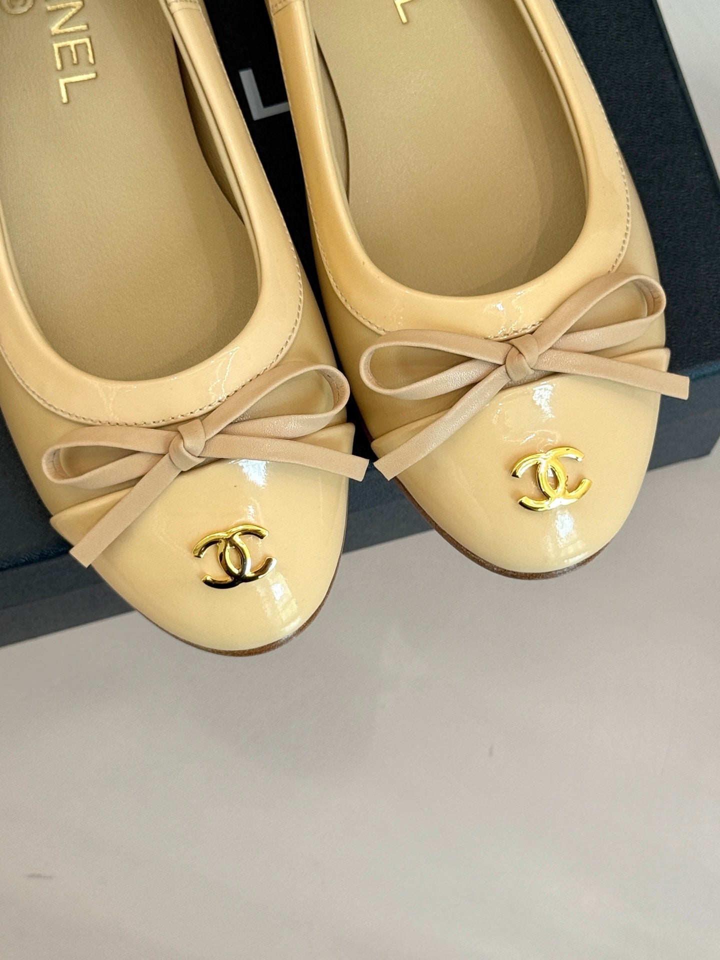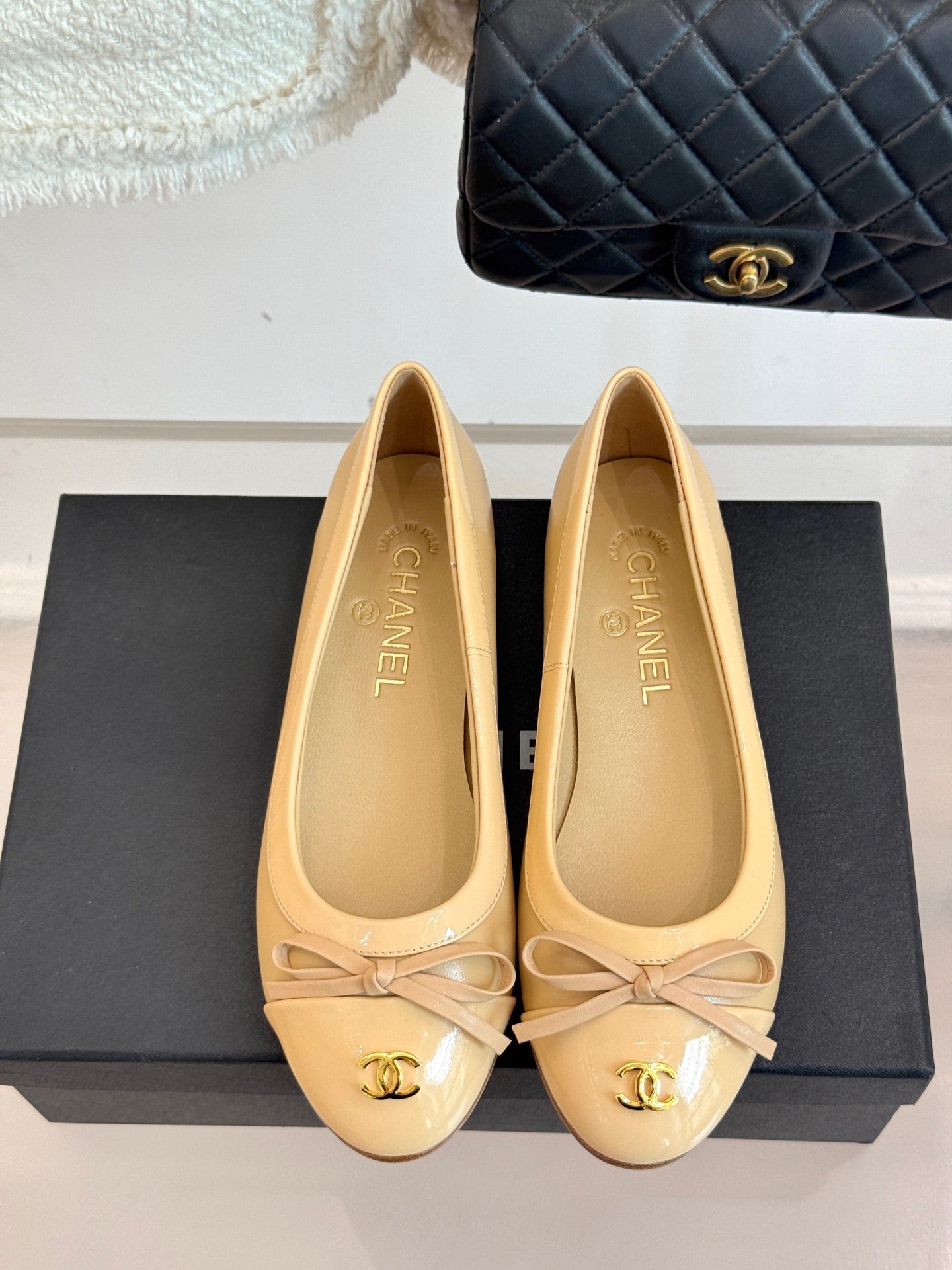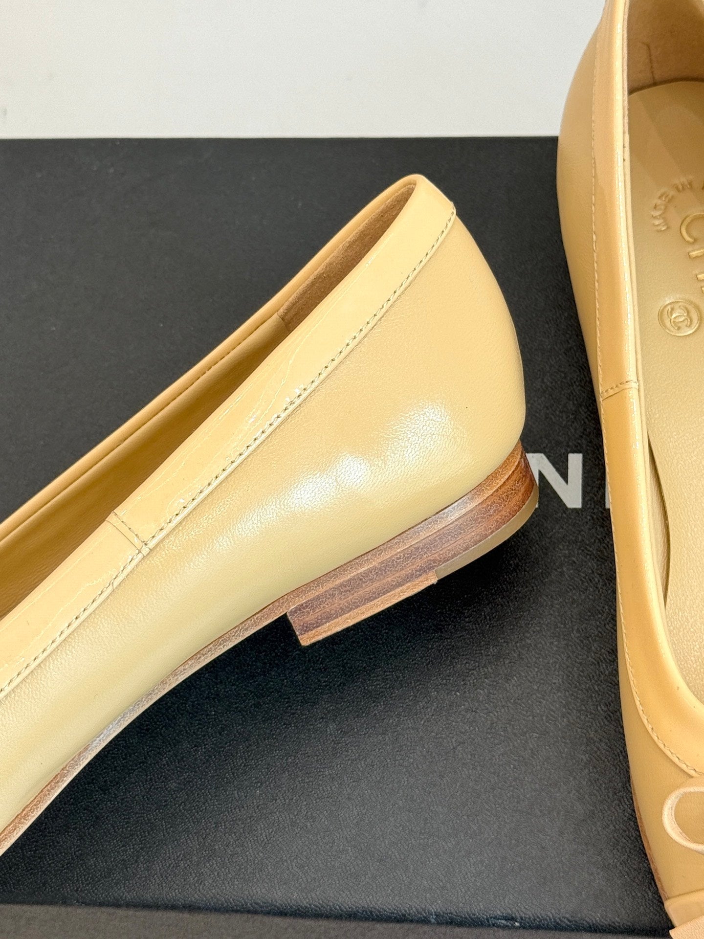 Chanel 25 Ballet Flat Tan Black Patent Leather 469255