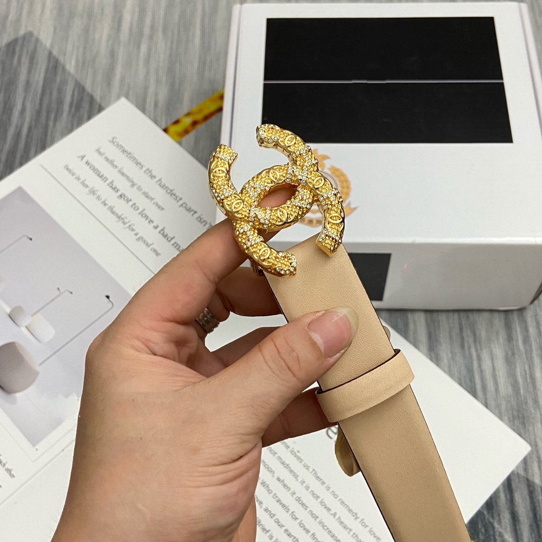 CC BELT 30MM BUCKLE GOLD DIAMOND LEATHER BEIGE