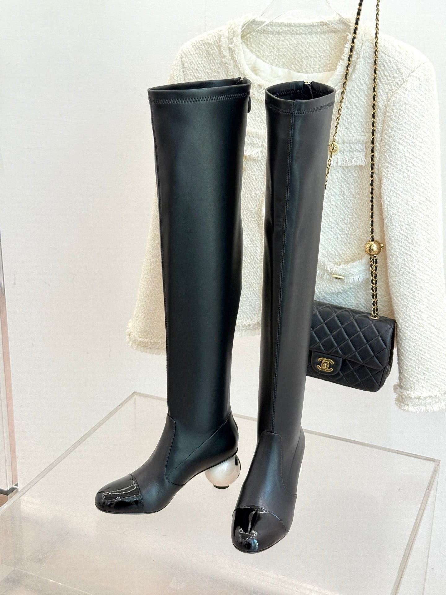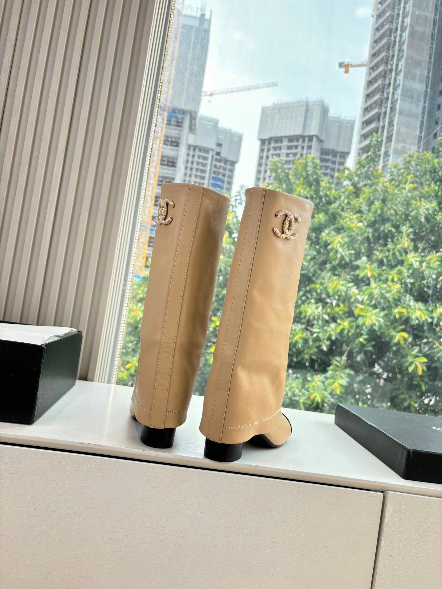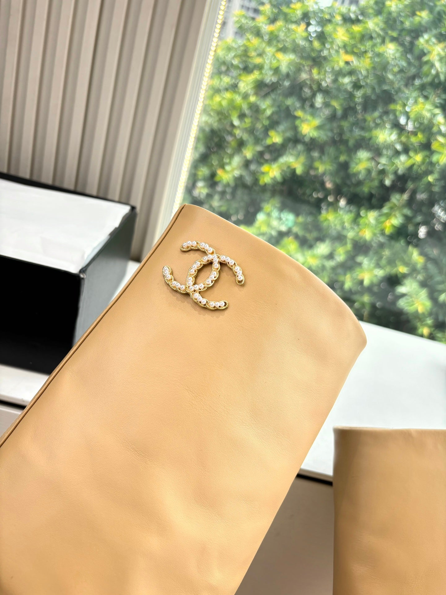 Chanel 25 Double C Giant Pearl Heel Long Boot Beige Black Sheepskin 465411