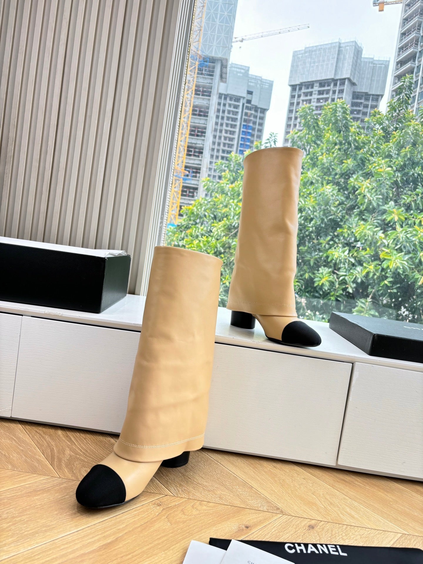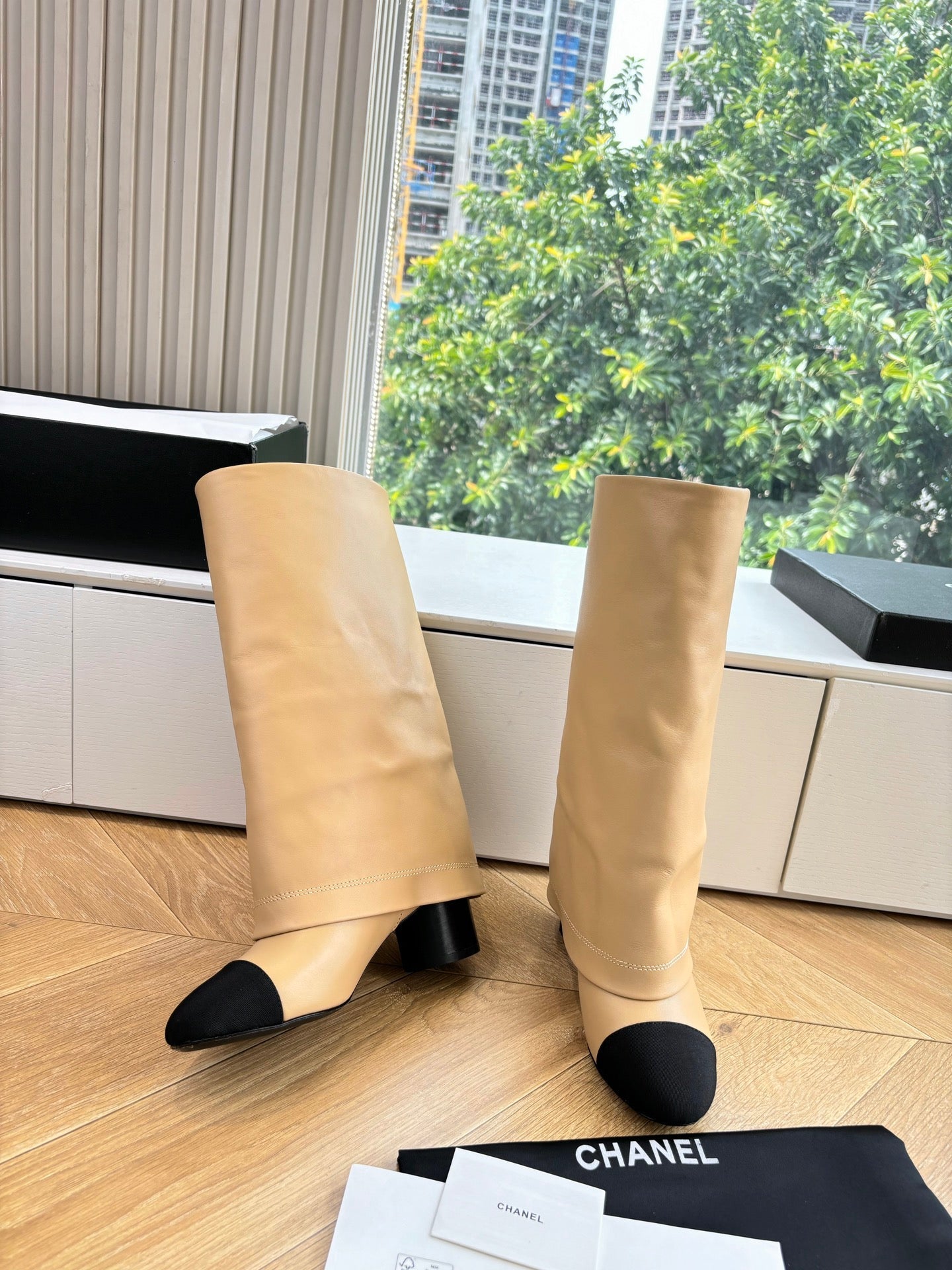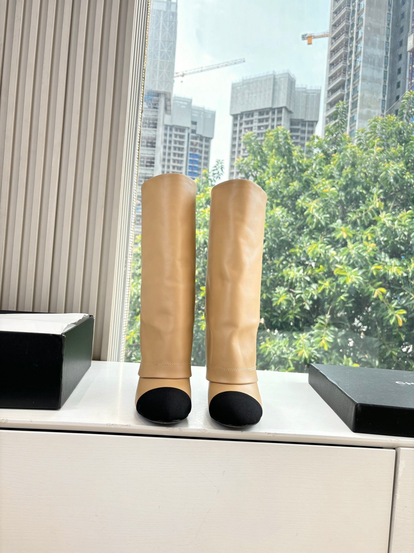 Chanel Double C Colorblock Heel Long Boot Beige Sheepskin 465418
