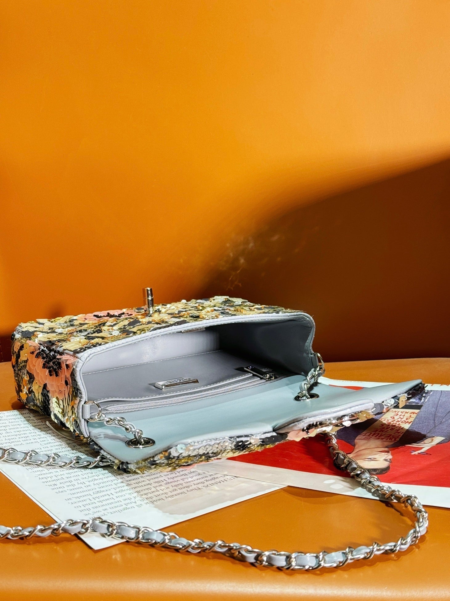 25C Flap Bag 21cm Dense Silver Sequin White Calfskin