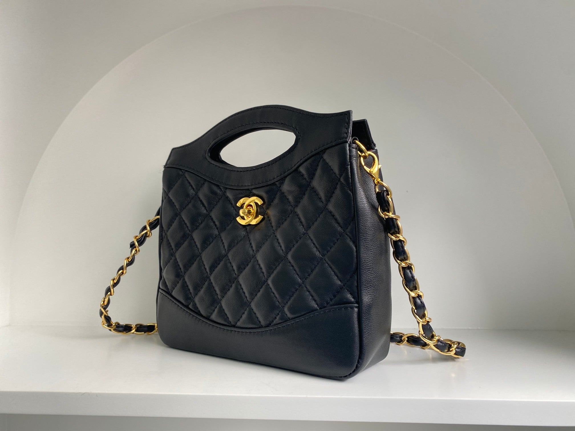 FLAP BAG 23 BLACK LAMBSKIN GOLD HARDWARE TOPHAND