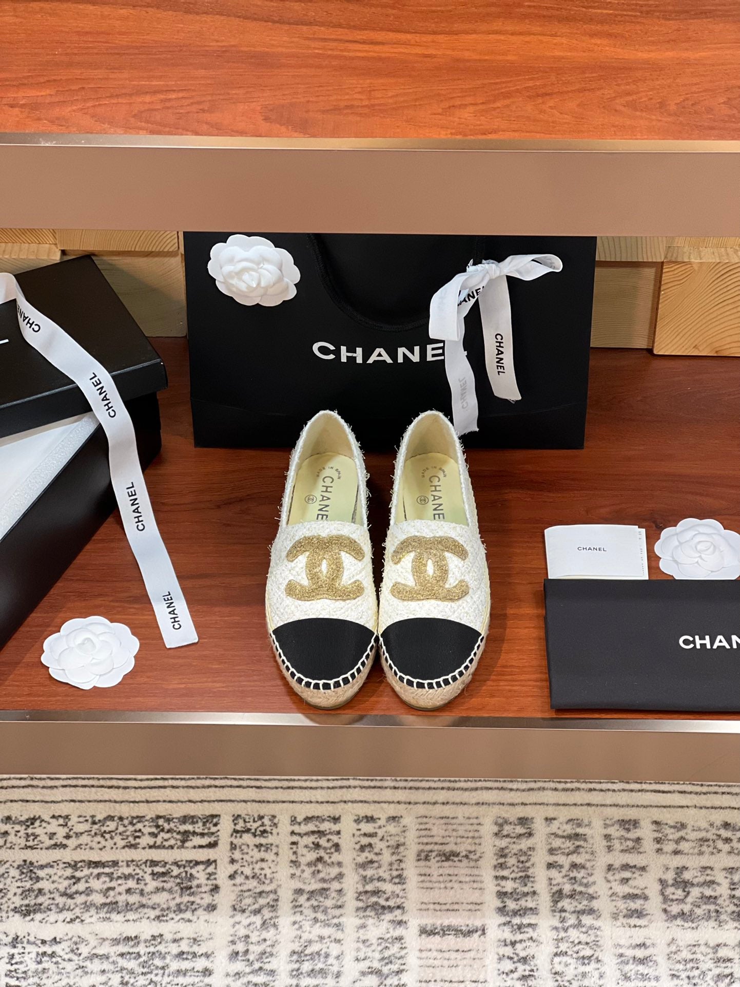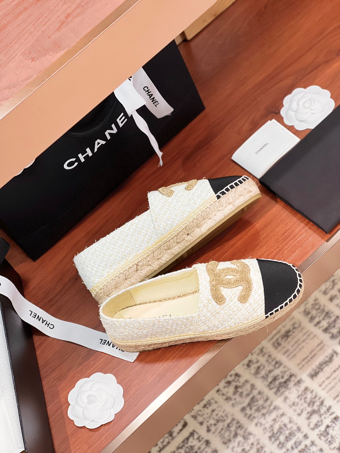 cc espadrilles gold white tweed black grosgrain