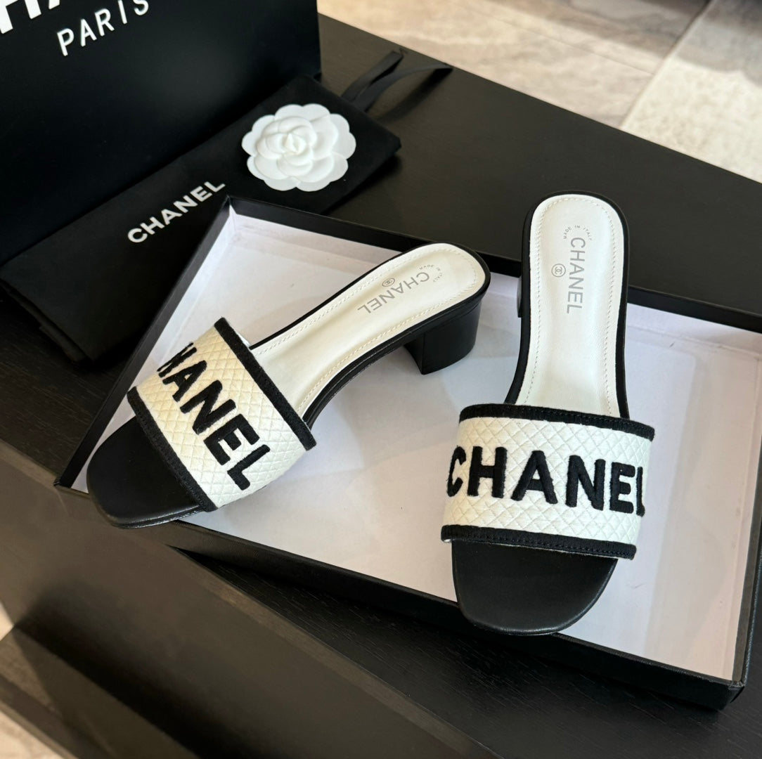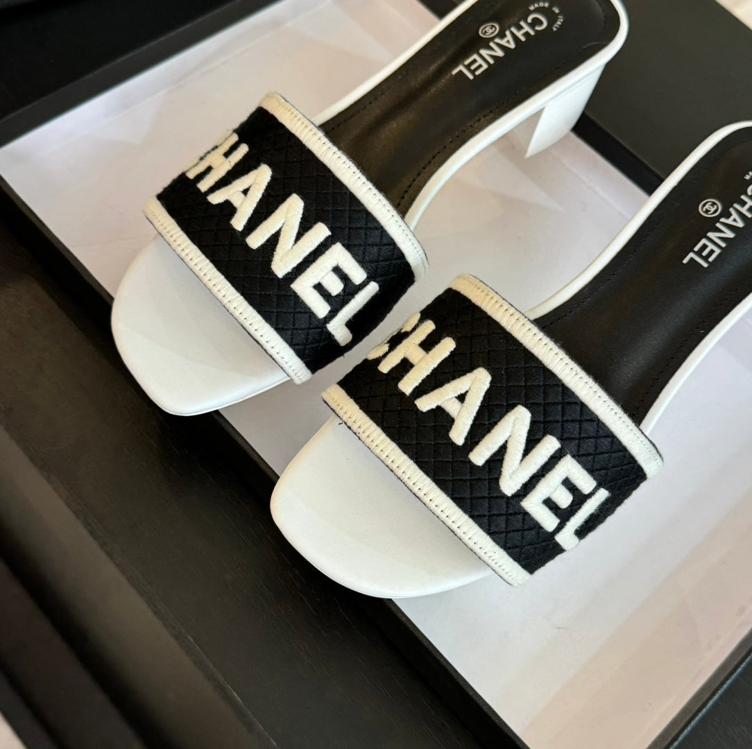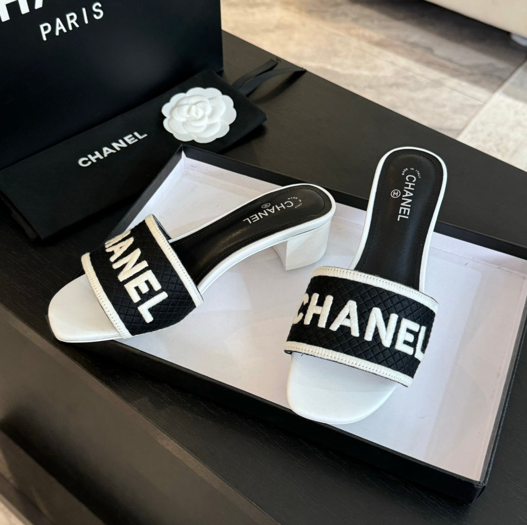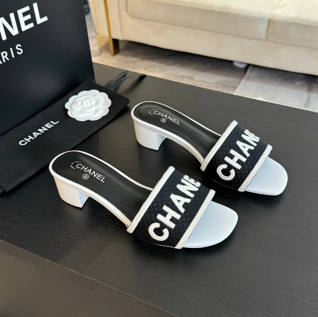 CC HIGH HEEL BLACK SATIN WITH WHITE RHINESTONES