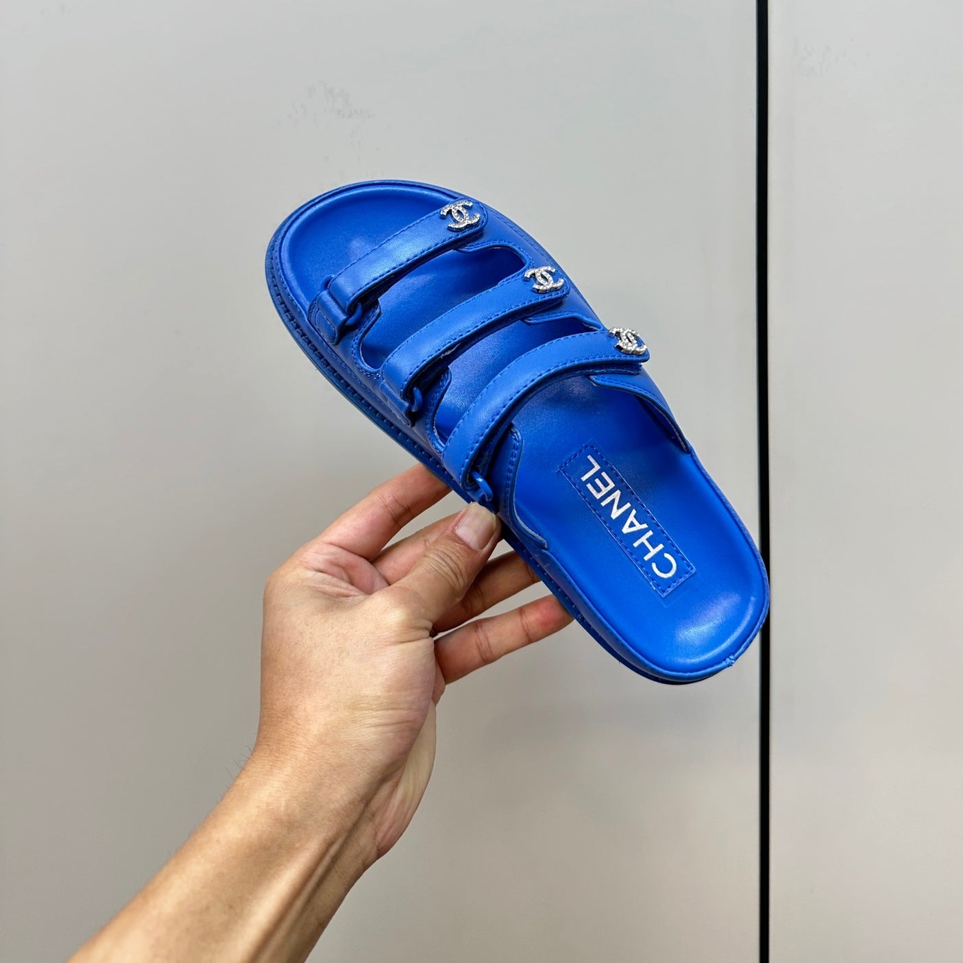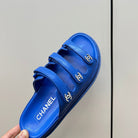 dad sandals blue triple strap lambskin mules