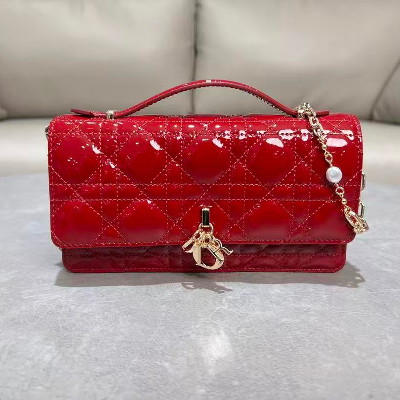 CD Pouch With Chain Cherry Red Patent Cannage Calfskin