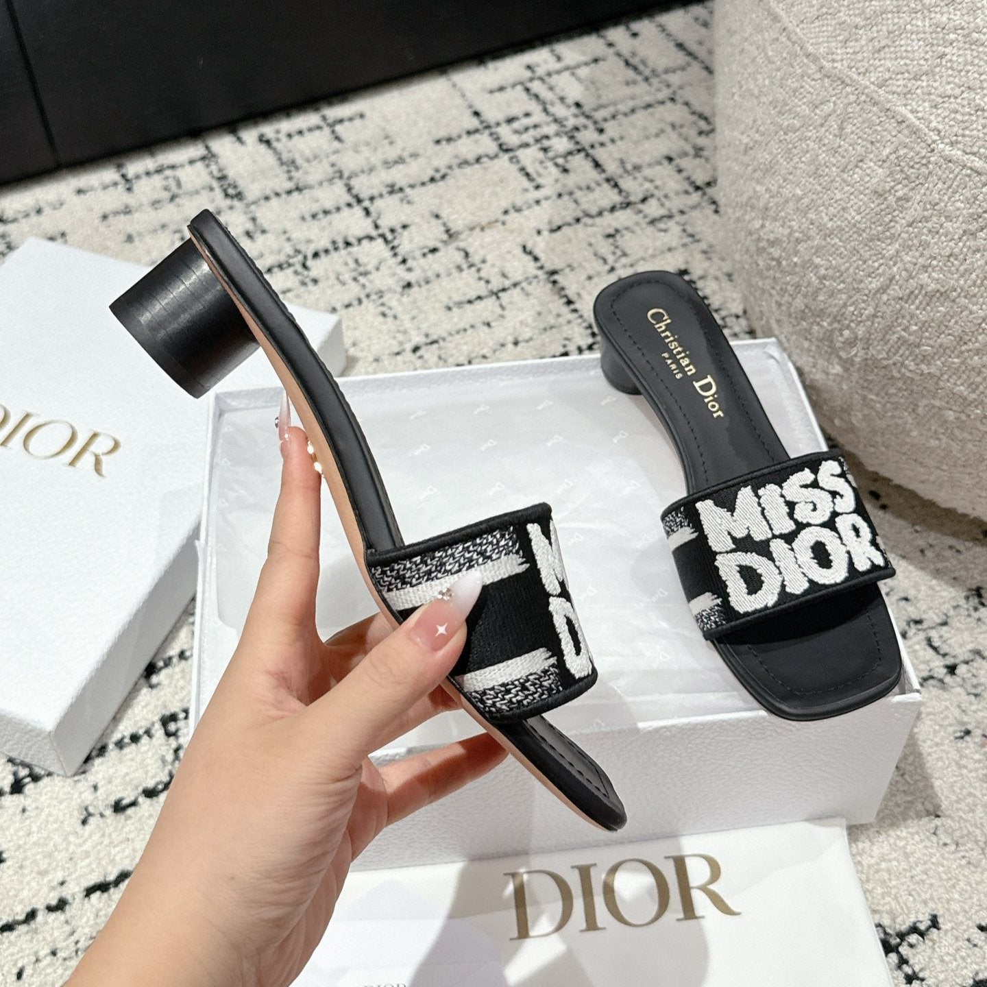 CD Dway Heeled Slide Black Mix White Embroidered Cotton