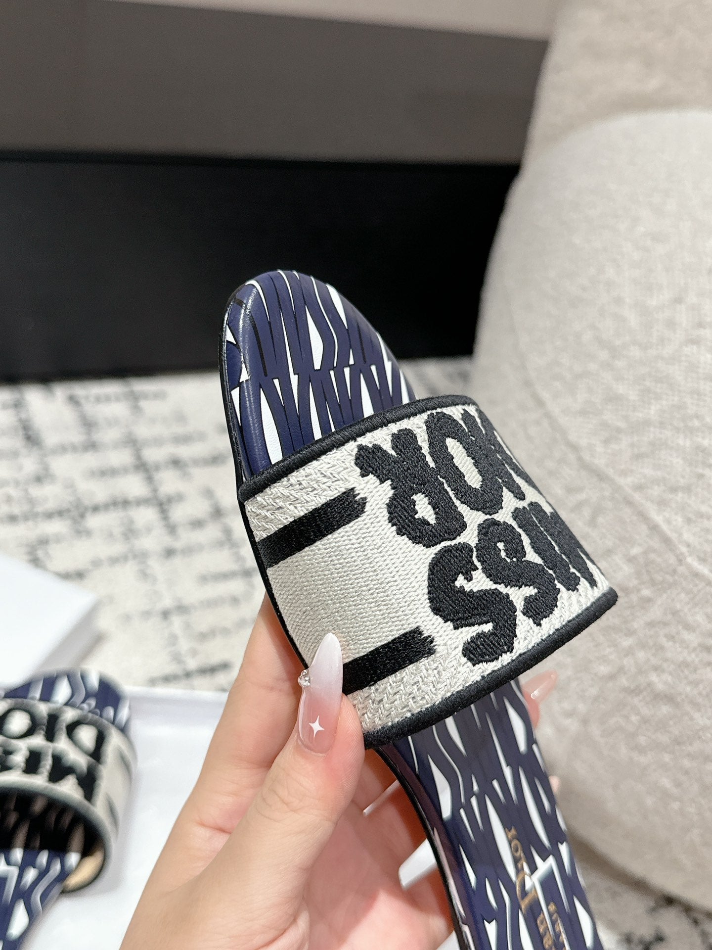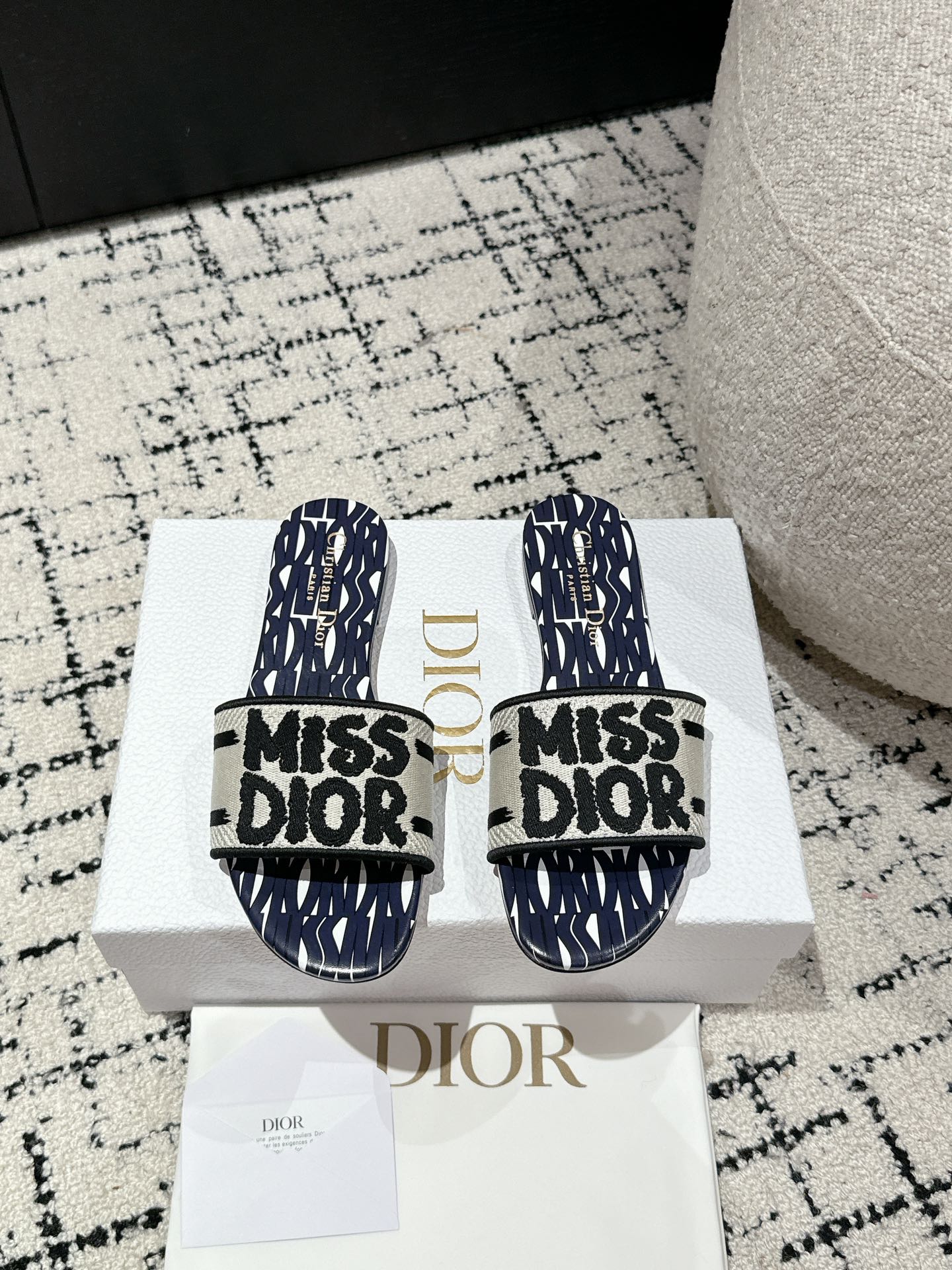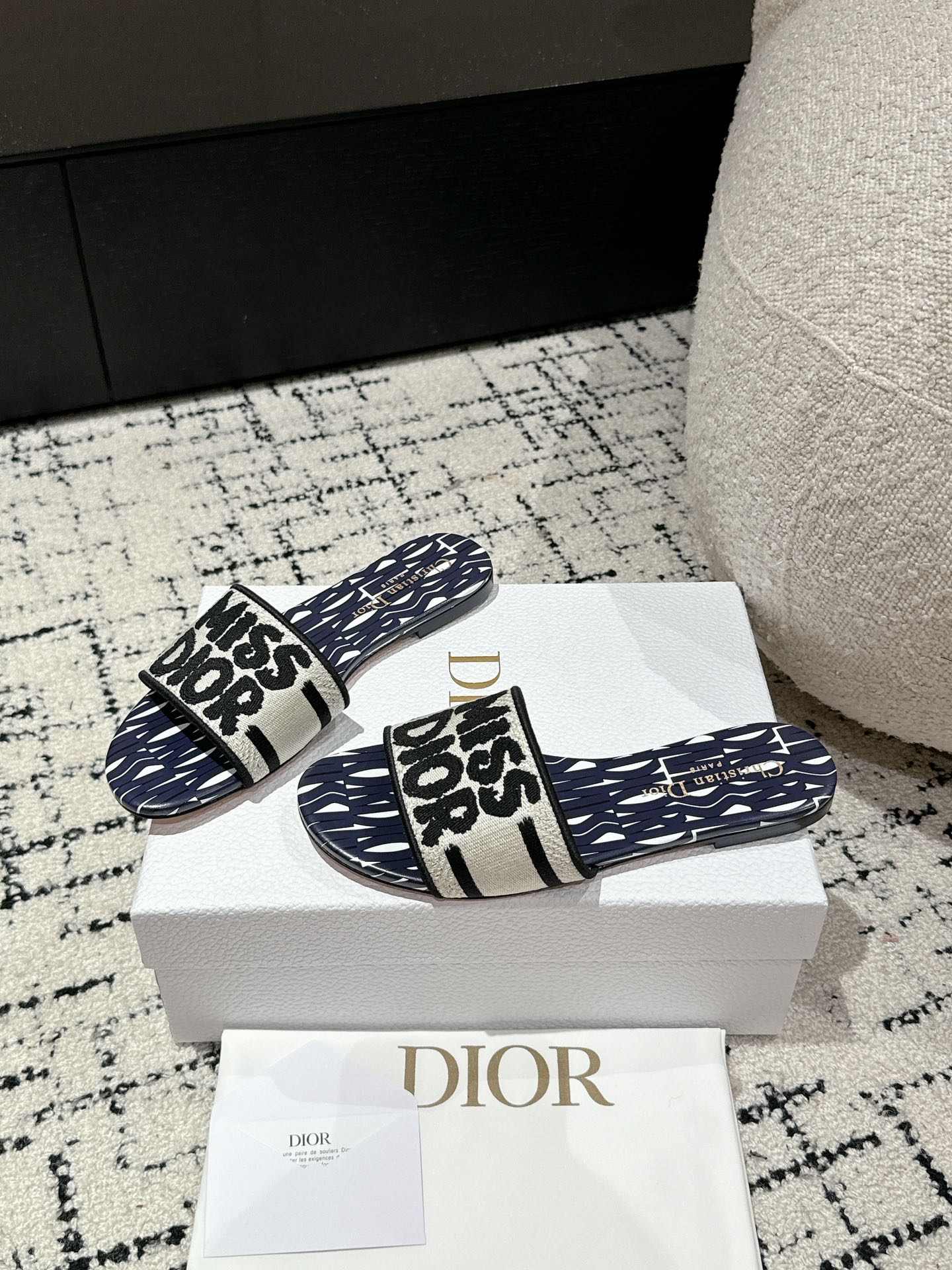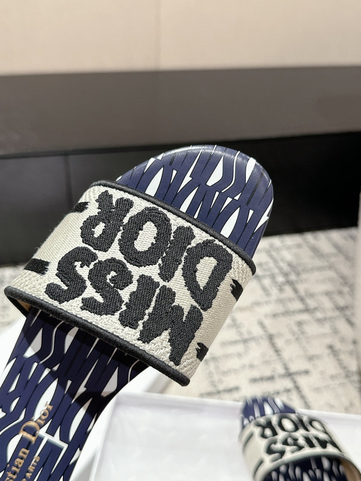 CD Dway Slide Deep Blue Mix White Black Embroidered Cotton