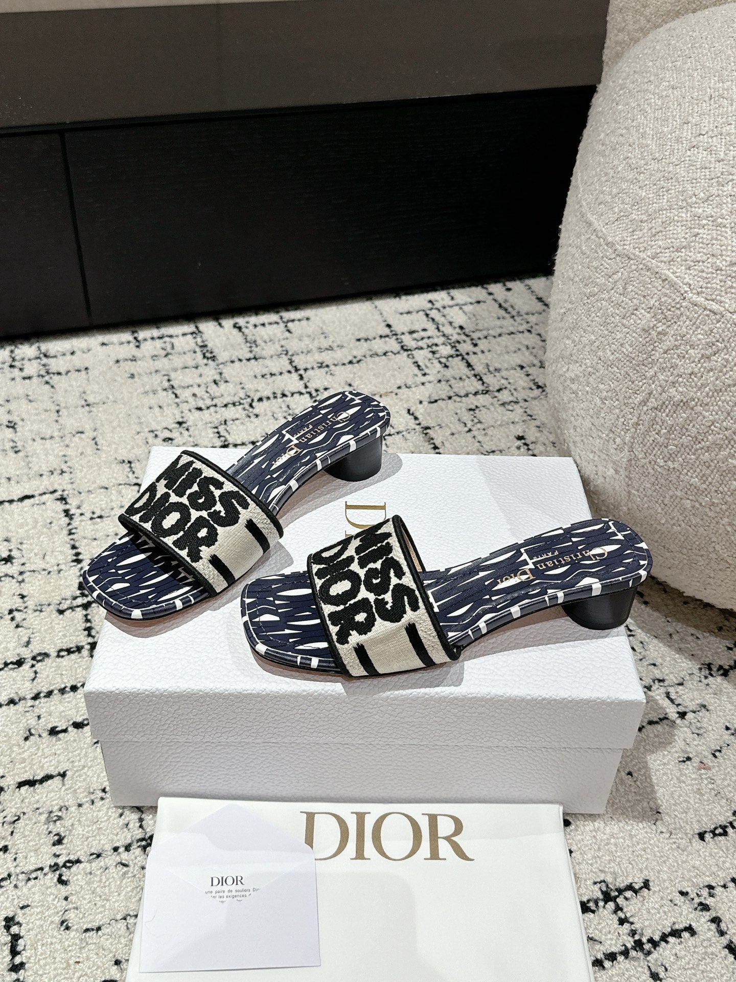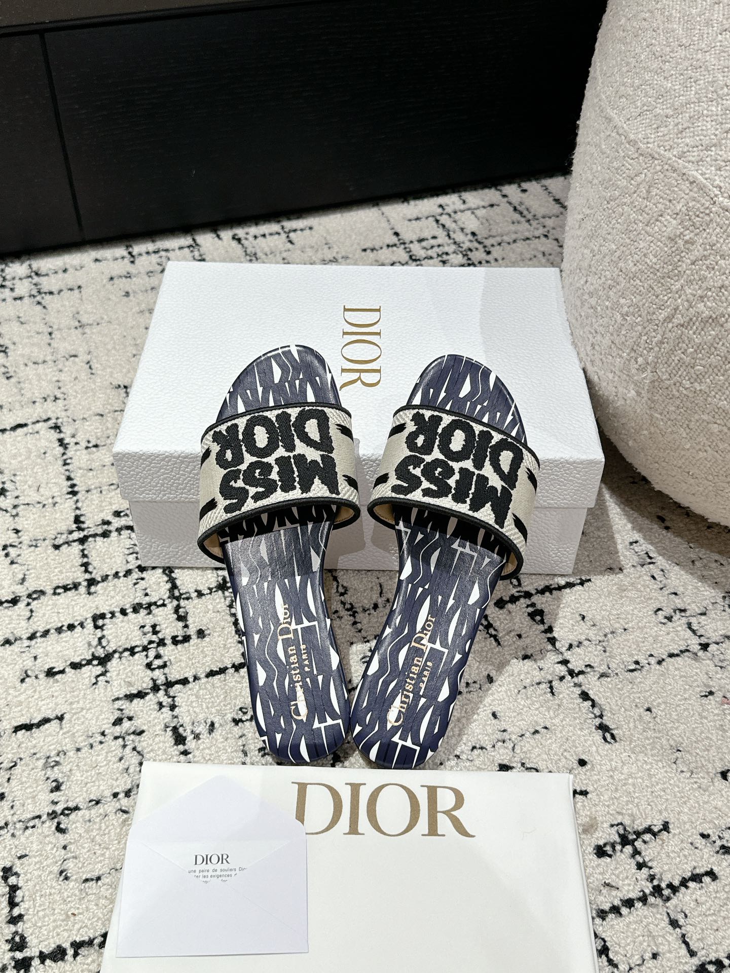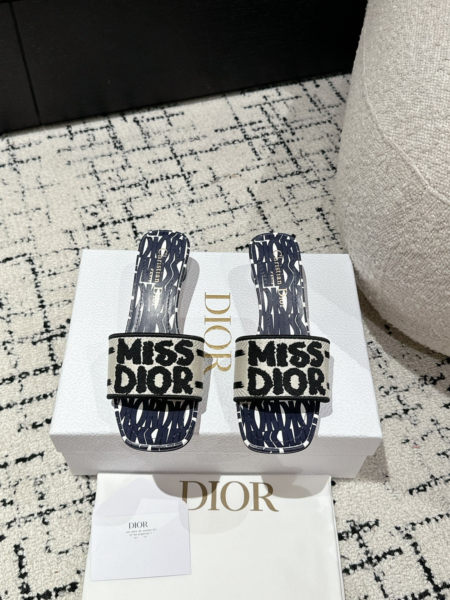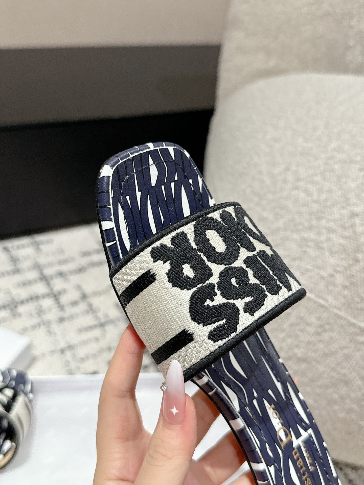 CD Dway Slide Deep Blue Mix White Black Embroidered Cotton