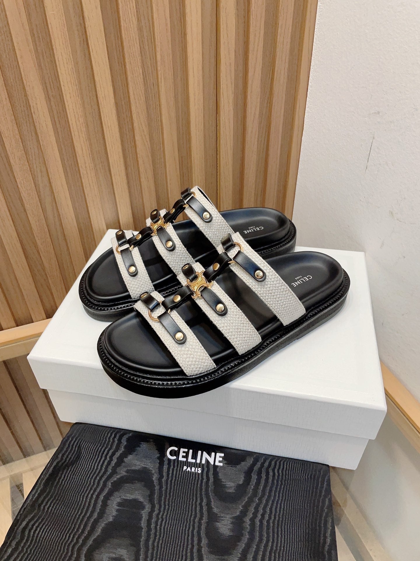 tippi slide sandal white black canvas calfskin