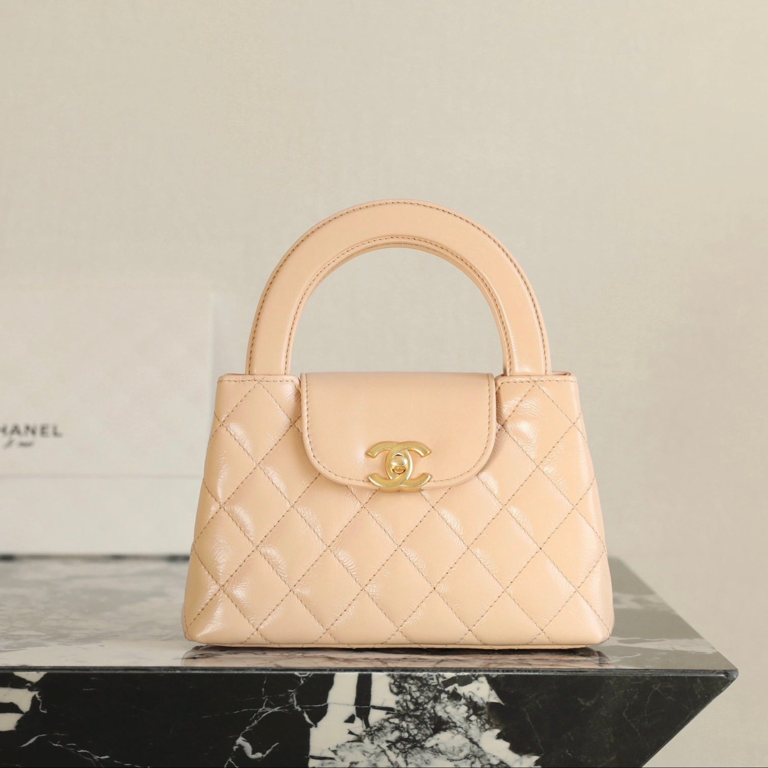 CC 24K Nano 19cm Kelly Shopper Bag Beige Patent Lambskin