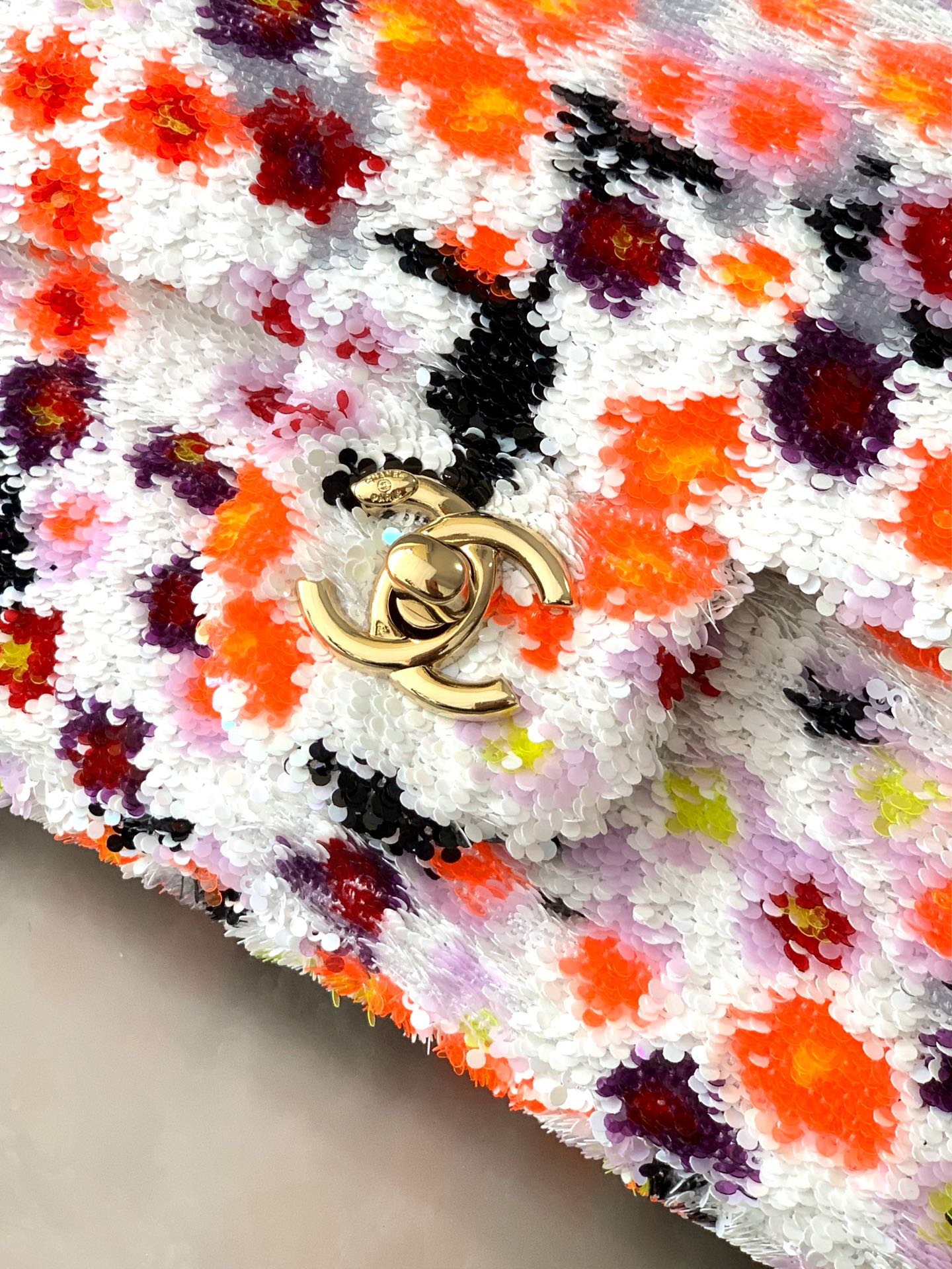 24S Flap Bag 25.5cm Multicolor Sequin Pink Flower Pearl Caflskin