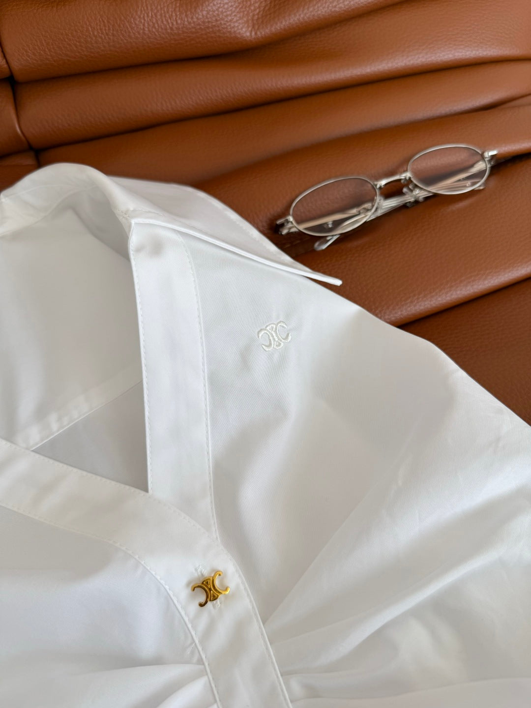 Celine 25 Arc de Triomphe Small Gold Button Pleated Dress White Cotton