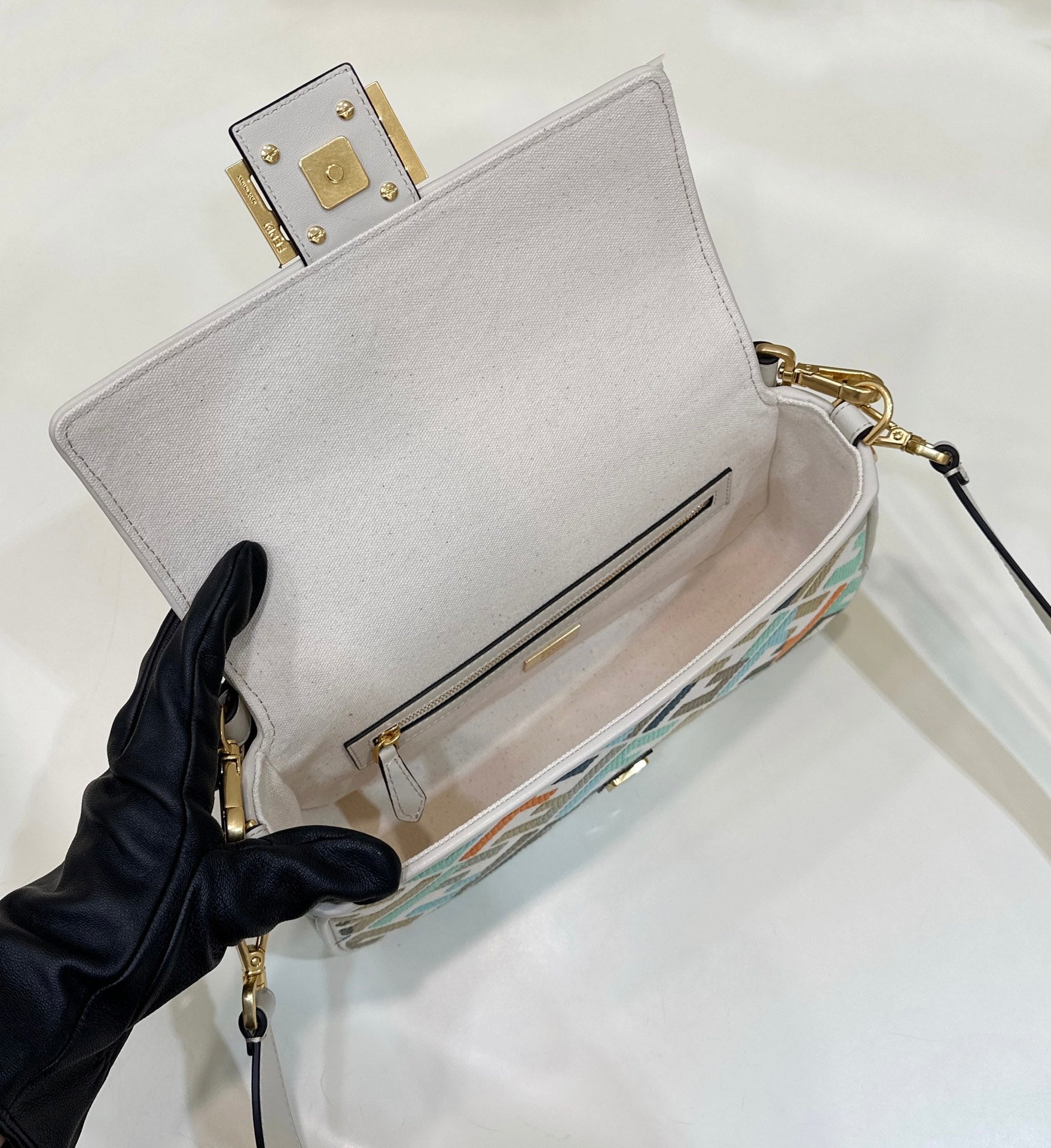 BAGUETTE CANVAS 27 BAG WITH MULTICOLOUR FF EMBROIDERY GOLD HARDWARE