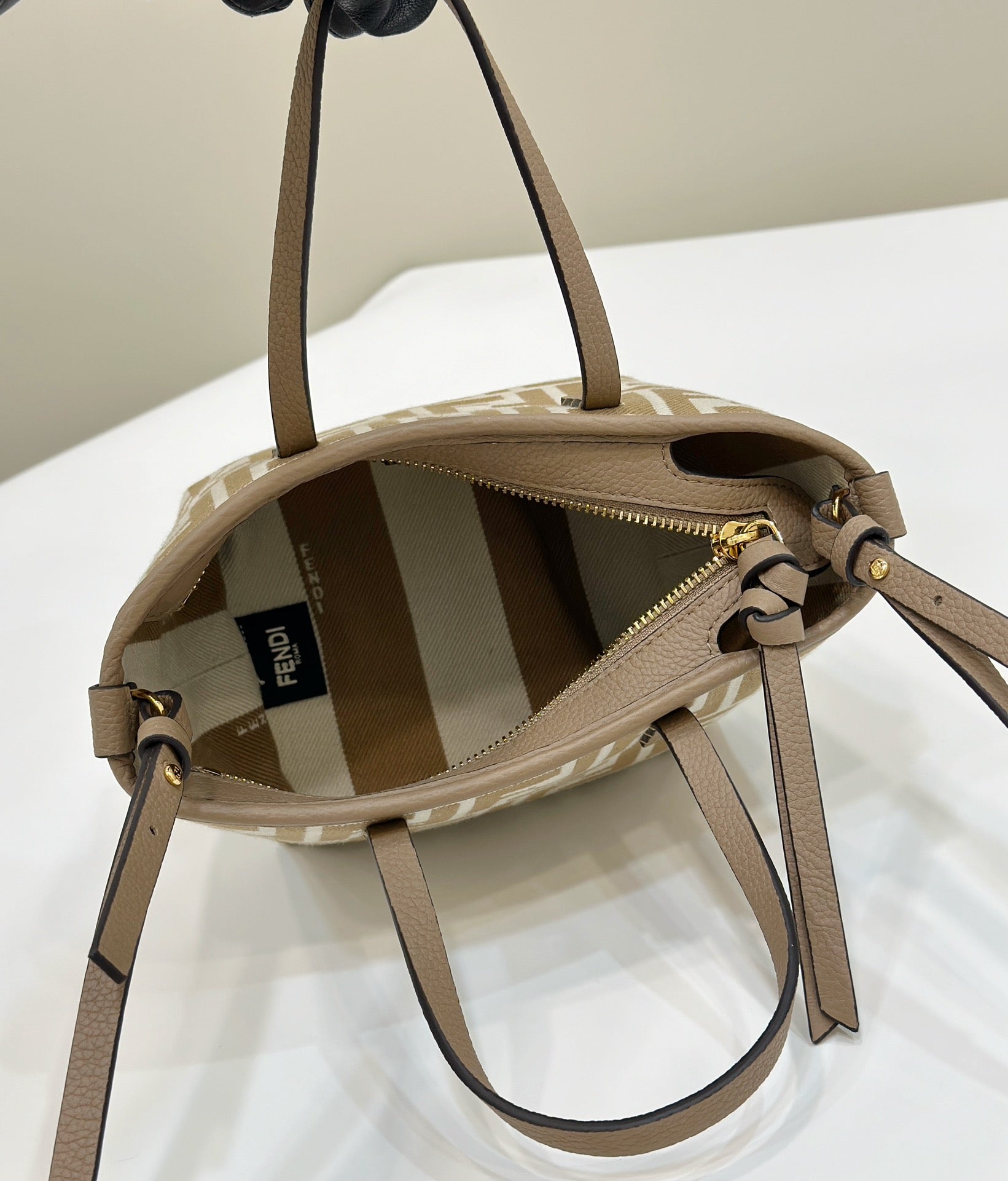 FENDI ROLL 33 TOTE BAG IN PEANUT BROWN MIX WHITE CANVAS