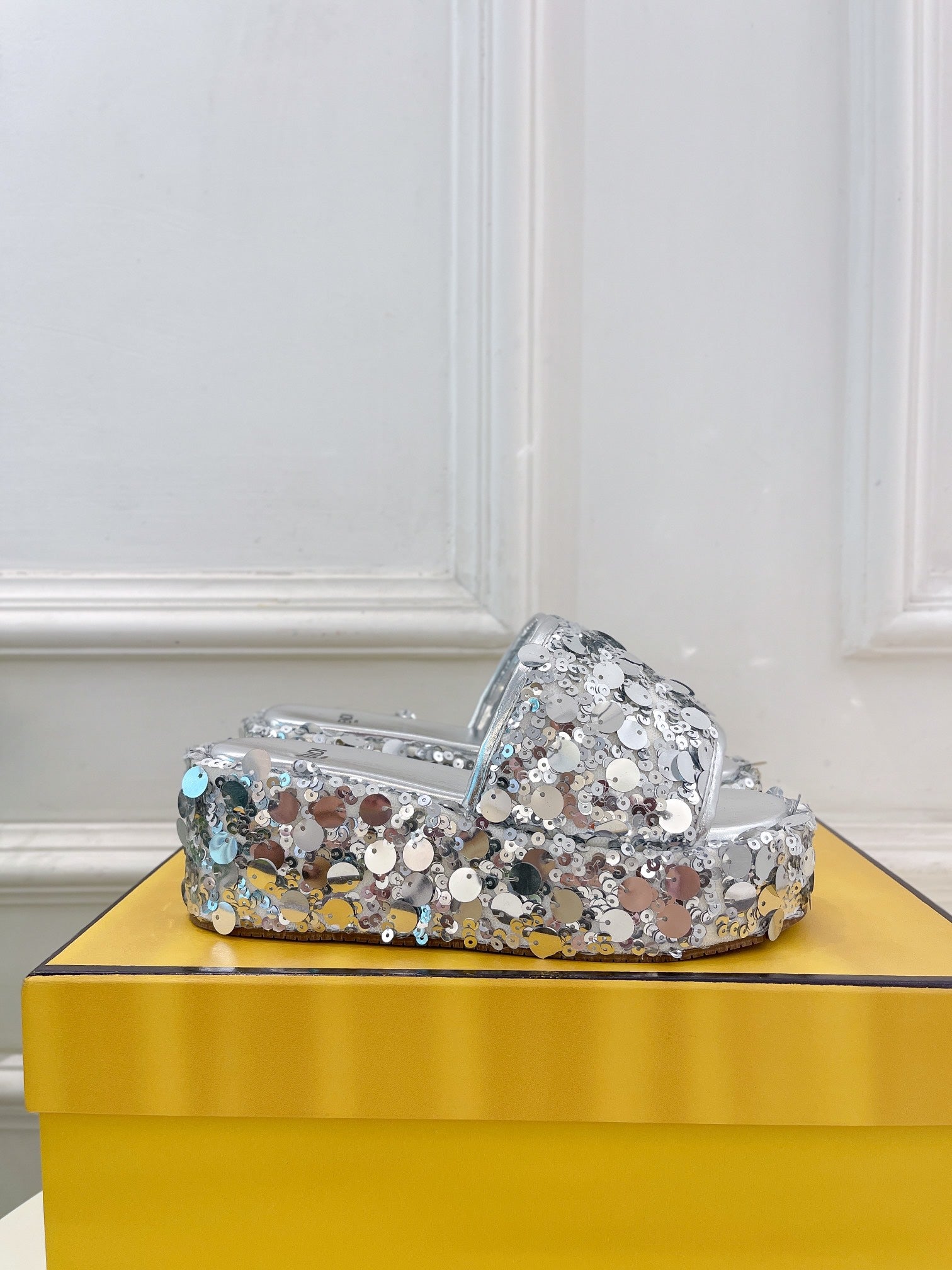FENDI THICK SOLE 3 CM SEQUIN SLIPPER SILVER