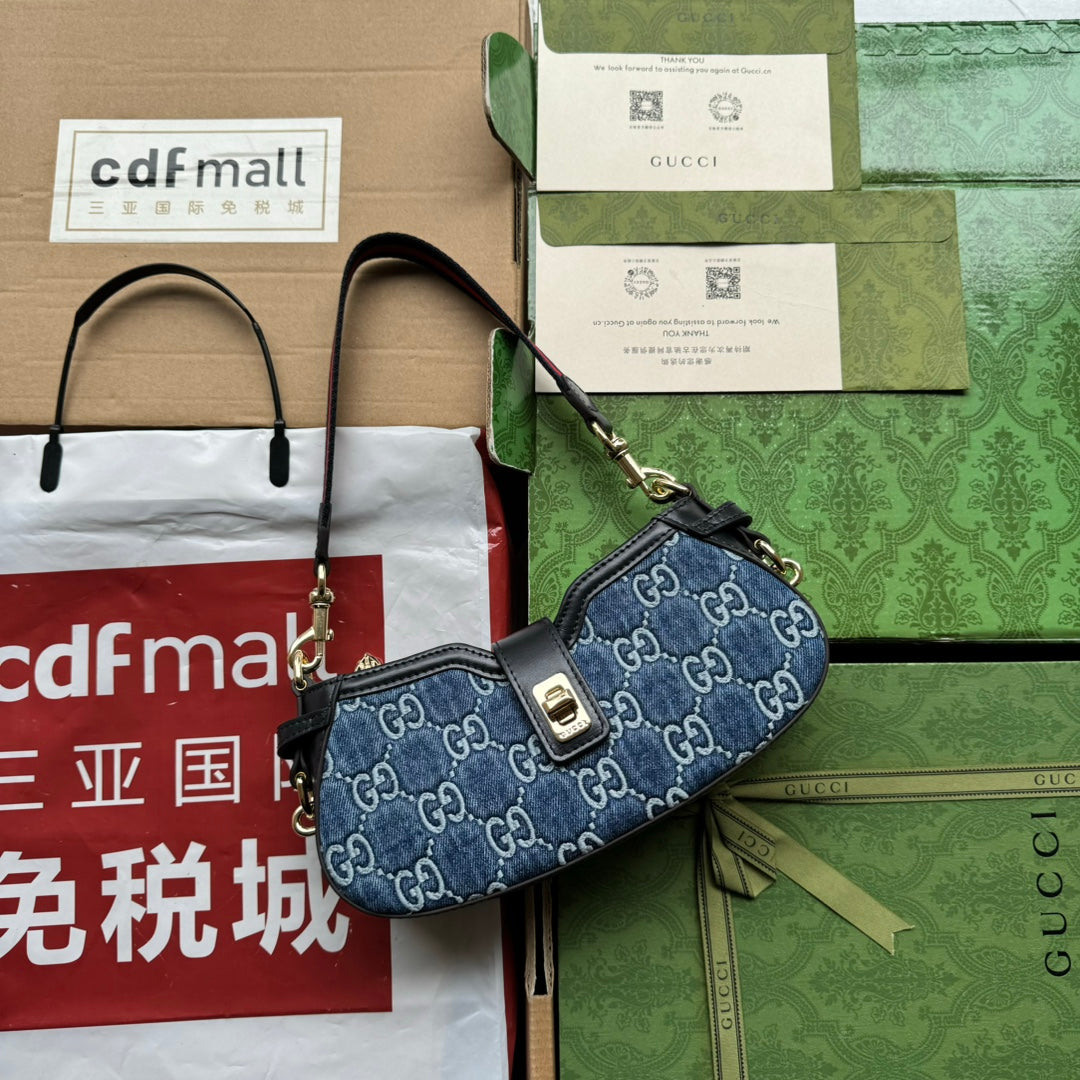 MOON SIDE SHOULDER BAG 24 IN BLUE EMBOSSED DENIM AND BLACK CALFSKIN TRIM GOLD HARDWARE