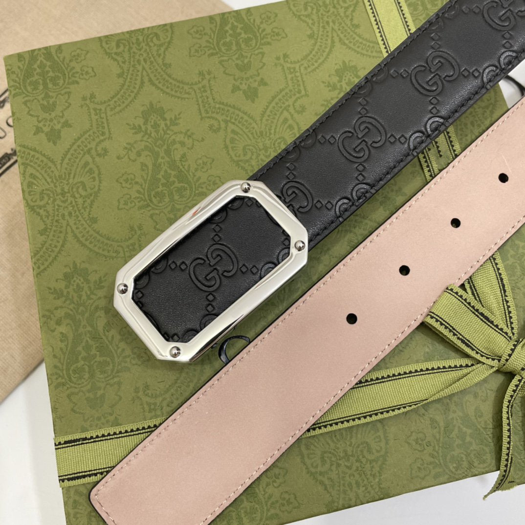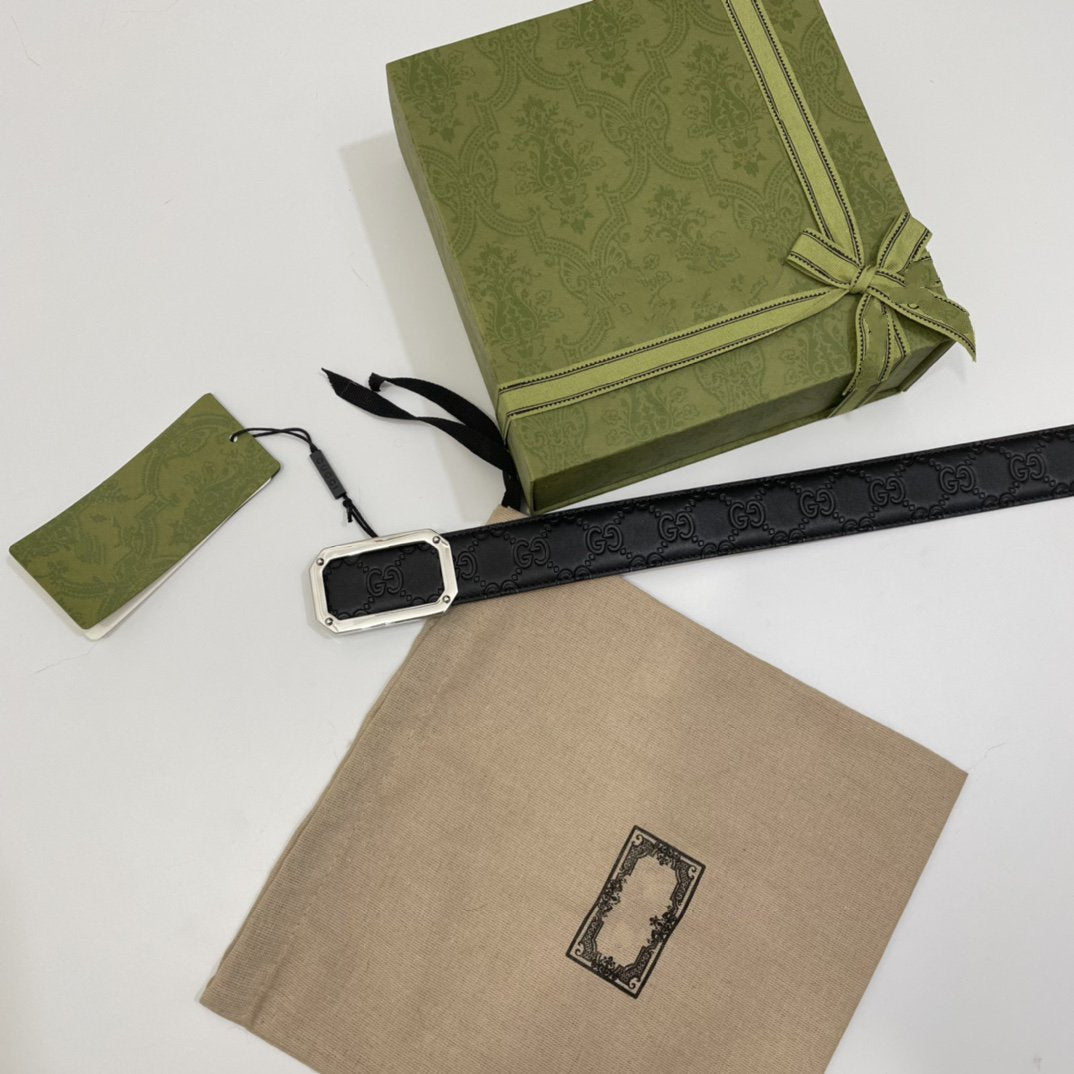 G BELT SILVER SQUARE BUCKLE BLACK LEATHER 3.5CM