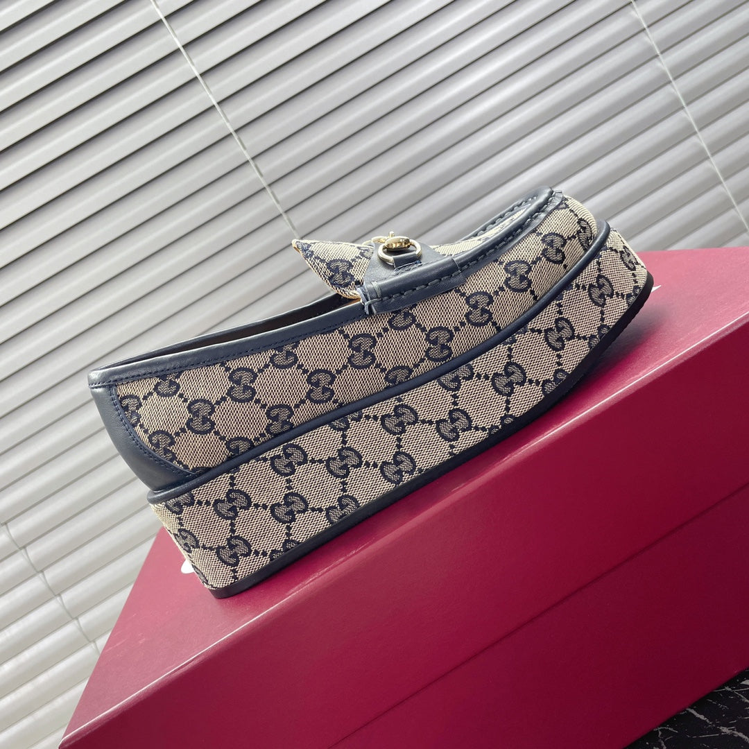HORSEBIT PLATFORM LOAFER IN TAN BEIGEMONOGRAM JACQUARD FABRIC AND NAVY BLUE CALFSKIN