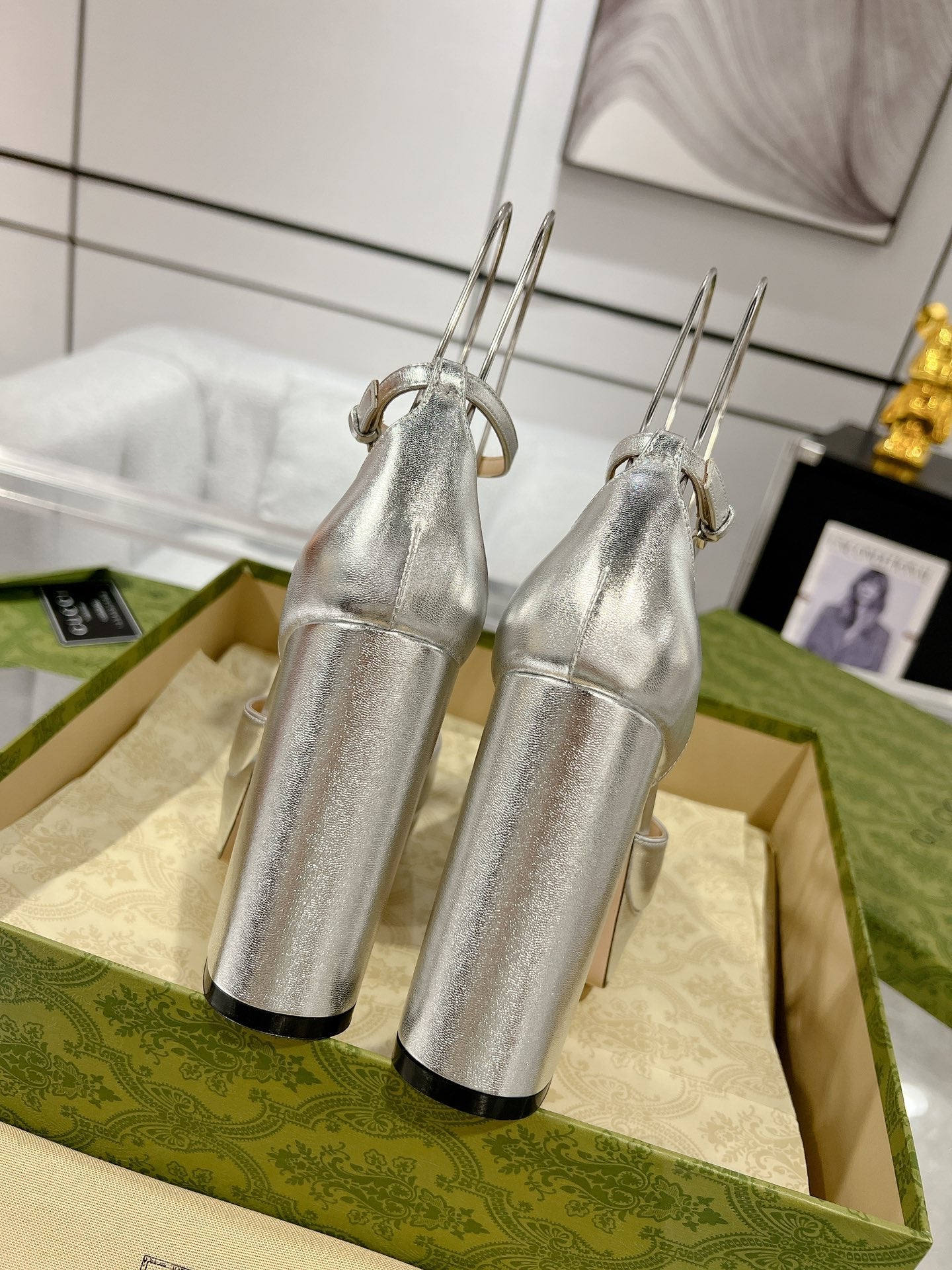 HIGH WEDGE PLATFORM IN SILVER CALFSKIN WITH GOLD HARDWARE