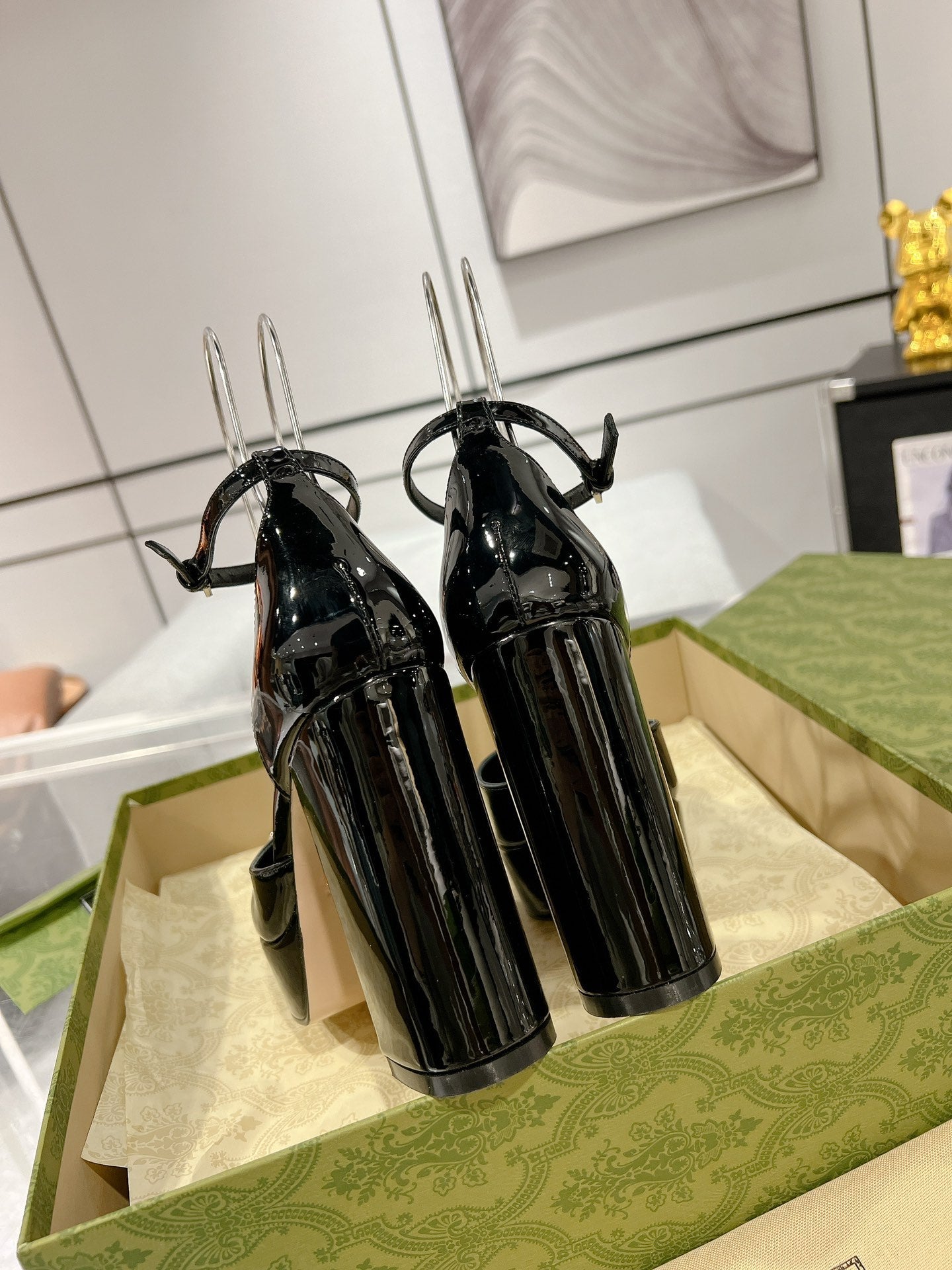HIGH WEDGE PLATFORM IN BLACK CALFSKIN WITH GOLD HARDWARE