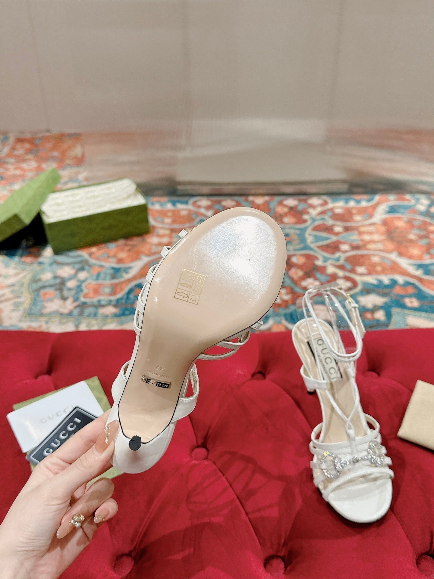 GG CRYSTAL HIGH HEEL SANDAL SCARLET LAMBSKIN