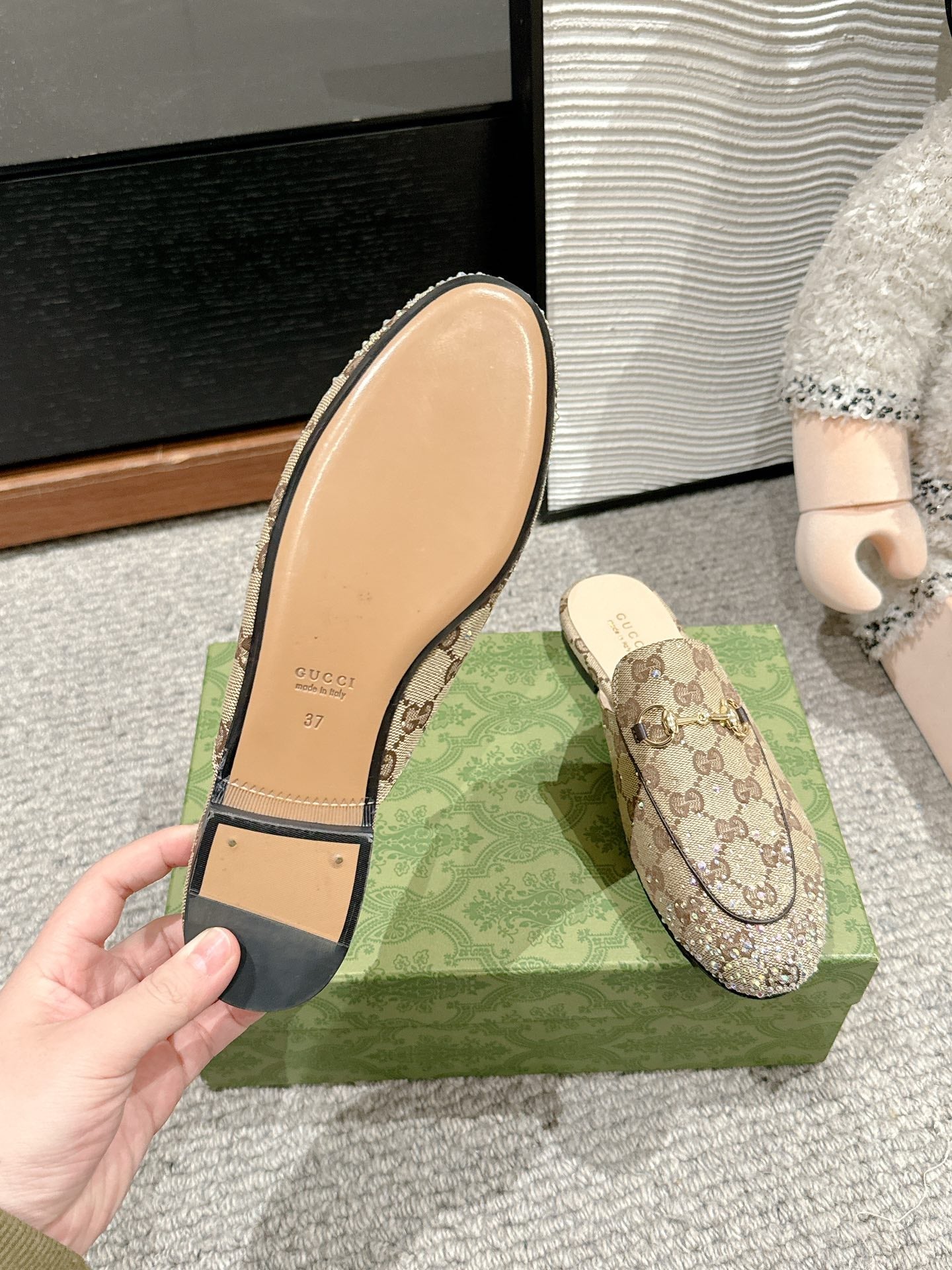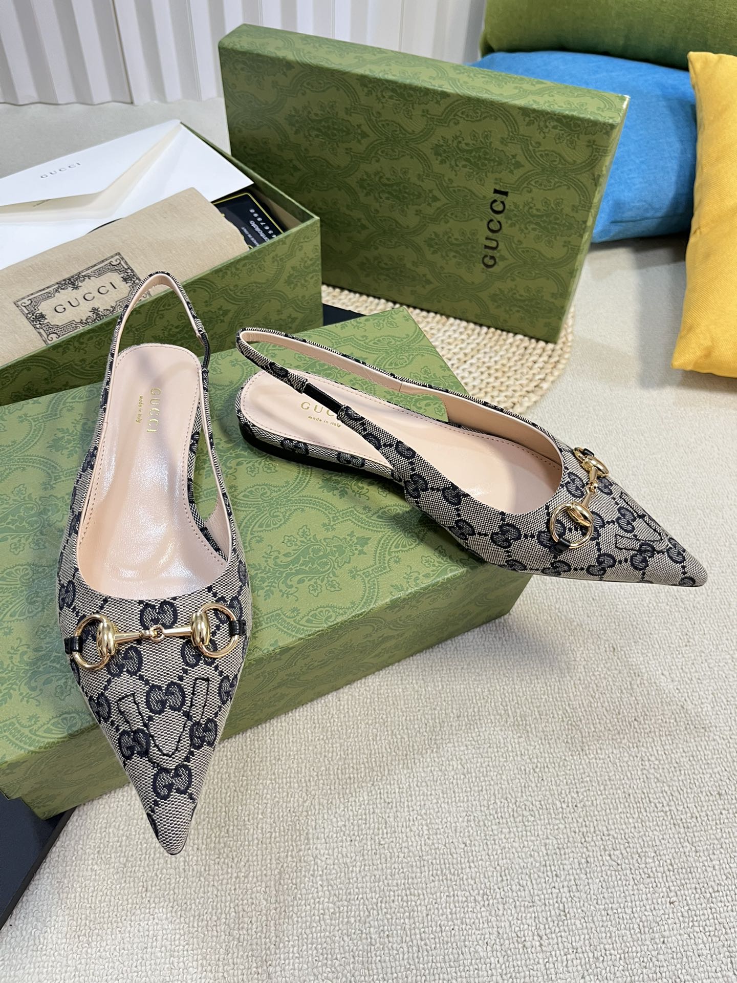GG Horsebit Slingback Flat Beige Ebony Monogram Canvas Point Toe Crystal-Embellished