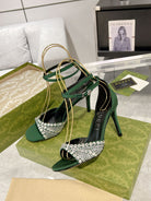 GG CRYSTAL ASTLETON GREEN HIGH HEEL SANDALS SATIN