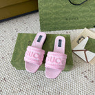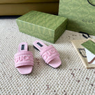 GG SLIDE SANDAL WITH GUCCI SCRIPT PASTEL PINK DENIM