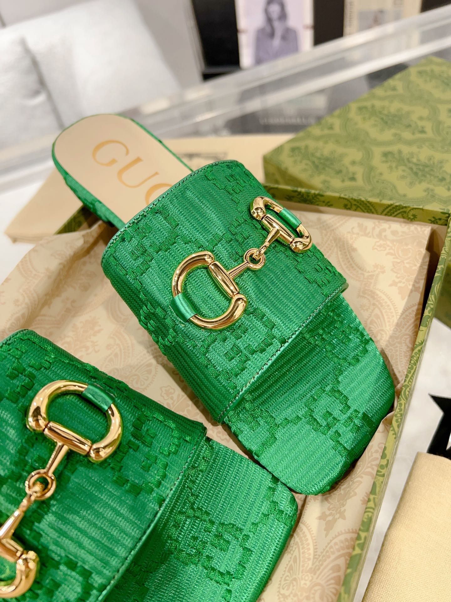 GG SPARKLE CRYSTAL SLIDE SANDAL METALLIC GREEN CALFSKIN