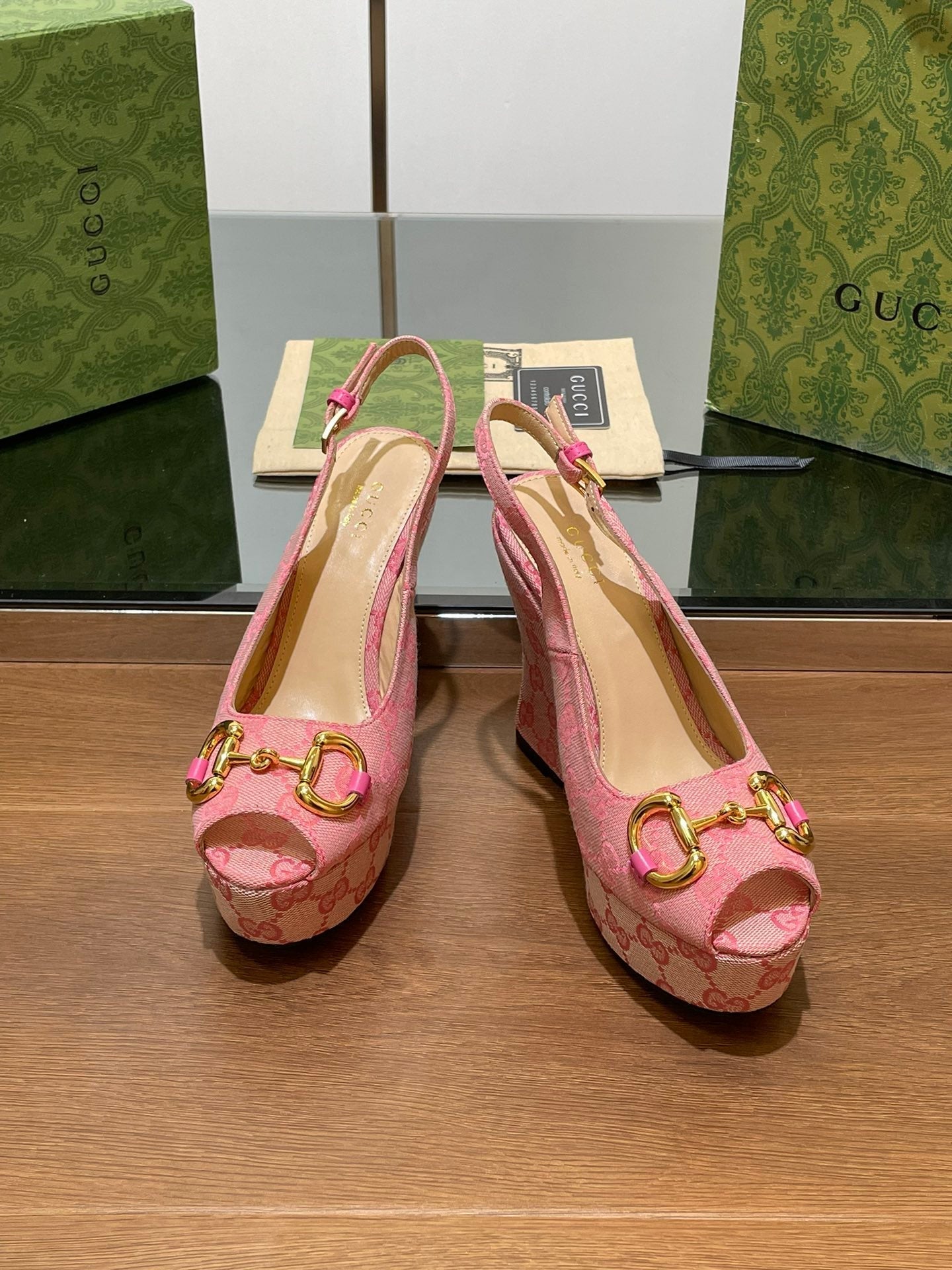 GG WEDGE PLATFORM IN LIGHT PINK MONOGRAM JACQUARD FABRIC